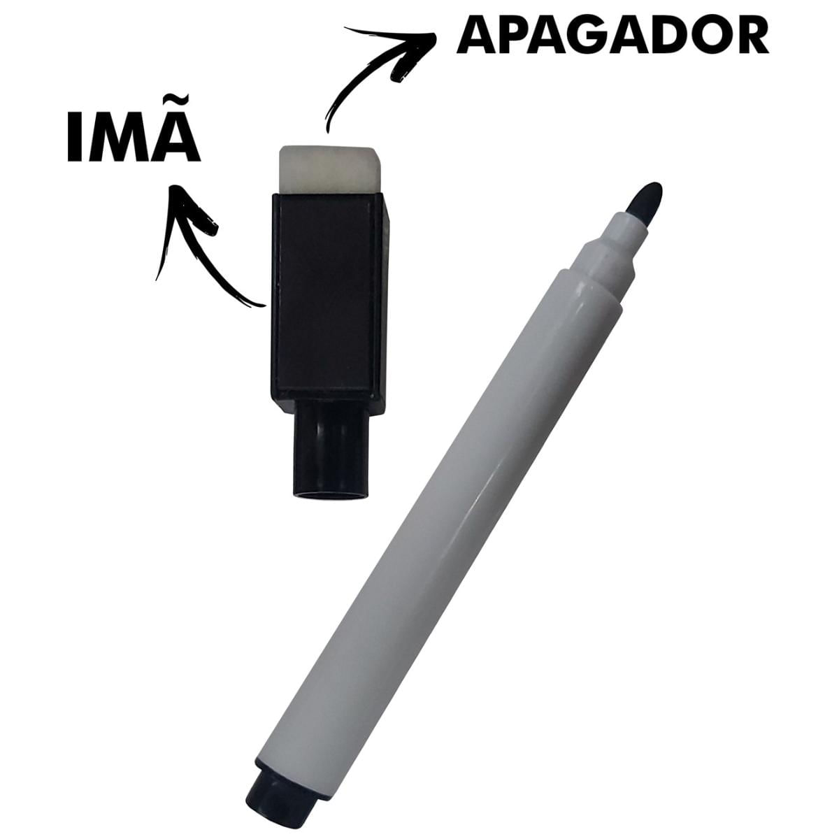 Todas as canetas possuem a tinta e a tampa de cor preta, na ponta da tampa encontra-se uma espuma para apagar e na lateral um imã que permite que grudem em superfícies metálicas. Contém: • 1 Caneta para quadro branco 11x1cm com apagador e imã na tampa Trabalhamos com produtos novos a pronta entrega. Postamos em até 24h úteis após confirmação do pagamento.