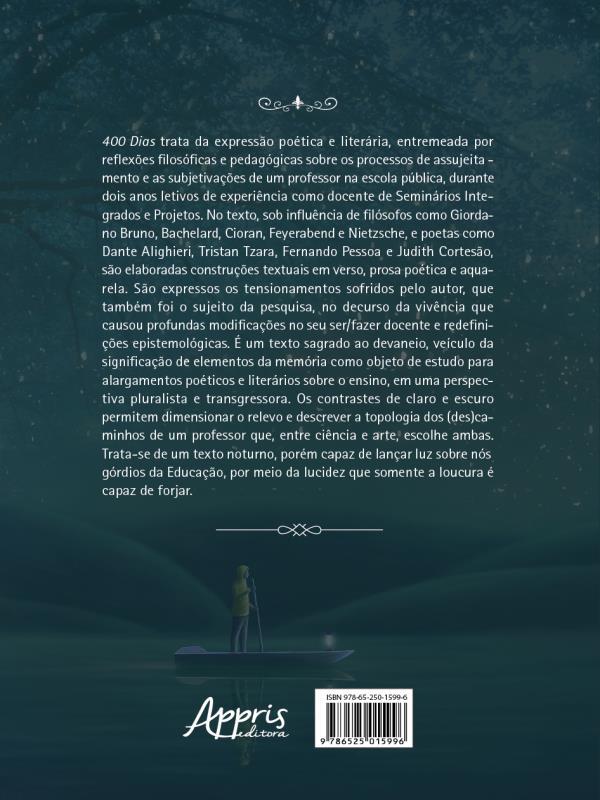 400 Dias Trata Da Expressão Poética E Literária, Entremeada Por Reflexões Filosóficas E Pedagógicas Sobre Os Processos De Assujeitamento E As Subjetivações De Um Professor Na Escola Pública, Durante Dois Anos Letivos De Experiência Como Docente De Seminários Integrados E Projetos. No Texto, Sob Influência De Filósofos Como Giordano Bruno, Bachelard, Cioran, Feyerabend E Nietzsche, E Poetas Como Dante Alighieri, Tristan Tzara, Fernando Pessoa E Judith Cortesão, São Elaboradas Construções Textuais Em Verso, Prosa Poética E Aquarela. S&atil De,o Expressos Os Tensionamentos Sofridos Pelo Autor, Que Também Foi O Sujeito Da Pesquisa, No Decurso Da Vivência Que Causou Profundas Modificações No Seu Ser/fazer Docente E Redefinições Epistemológicas. É Um Texto Sagrado Ao Devaneio, Veículo Da Significação De Elementos Da Memória Como Objeto De Estudo Para Alargamentos Poéticos E Literários Sobre O Ensino, Em Uma Perspectiva Pluralista E Transgressora. Os Contrastes De Claro E Escuro Permitem Dimensionar O Relevo E Descrever A Topologia Dos (des)caminhos De Um Professor Que, Entre Ciência E Arte, Escolhe Ambas. Trata-se De Um Texto Noturno, Porém Capaz De Lançar Luz Sobre Os Nós Górdios Da Educação, Por Meio Da Lucidez Que Somente A Loucura É Capaz De Forjar.
