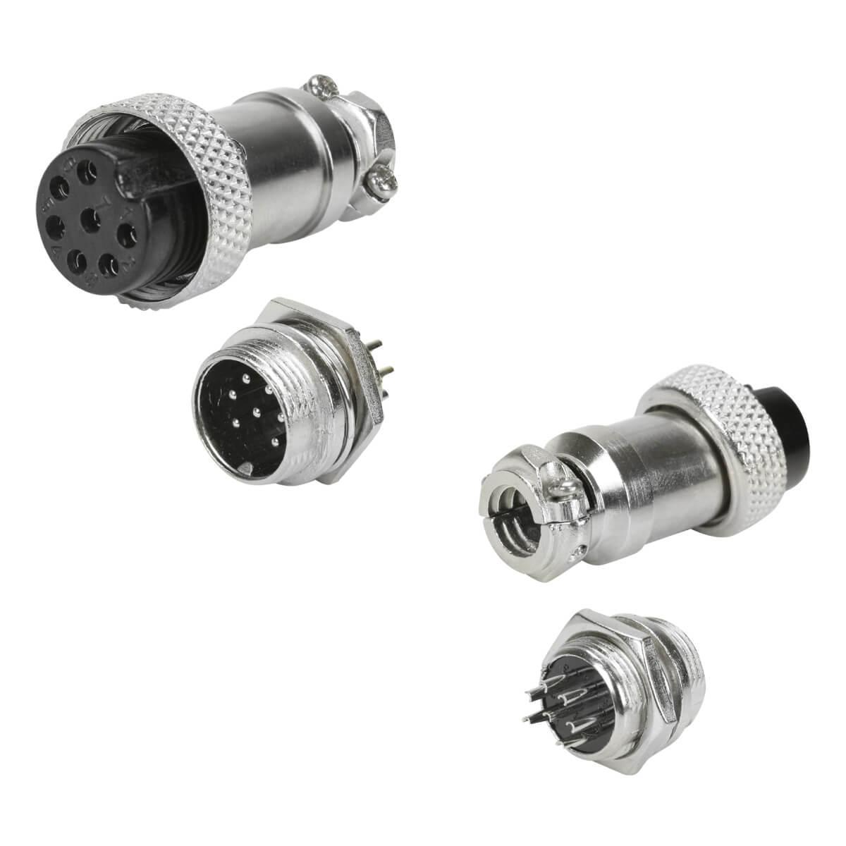 Conjunto De Conectores Mike (também Conhecidos Como Conectores Xlr) Projetados Para Serem Montados Em Um Painel Ou Placa De Circuito Impresso (pci). Esse Conjunto É Composto Por Um Conector Fêmea E Um Conector Macho, Ambos Com 7 Pinos.