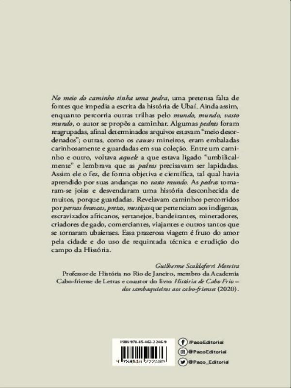 No Meio Do Caminho Tinha Uma Pedra, Uma Pretensa Falta De Fontes Que Impedem A Escrita Da História De Ubaí. Ainda Assim, Enquanto Percorria Outras Trilhas Pelo Mundo, Mundo, Vasto Mundo, O Autor Se Sentiu A Caminhar. Algumas Pedras Foram Reagrupadas, Afinal Certos Arquivos Estavam “meio Desordenados”, Outras, Como Os Causos Mineiros, Eram Embaladas Com Carinho E Guardadas Em Sua Coleção. Entre Um Caminho E Outro, Voltava Aquele A Que Estava Ligado “umbilical Mente” E Lembrava Que As Pedras Precisavam Ser Lapidadas. Assim Ele O Fez, De Forma Objetiva E Científica, Tal Qual Havia Aprendido Por Suas Andanças No Vasto Mundo. As Pedras Tornaram-se Joias E Desvendaram Uma História Desconhecida De Muitos, Porque Guardada. Revelavam Caminhos Percorridos Por Pernas Brancas, Pretas, Mestiças Que Permanecem Aos Indígenas, Escravizados Africanos, Sertanejos, Bandeirantes, Mineiros, Criadores De Gado, Comerciantes, Viajantes E Outros Tantos Que Se Tornaram Ubaienses. Essa Viagem Prazerosa É Fruto Do Amor Pela Cidade E Do Uso De Requintada Técnica E Erudição Do Campo Da História.