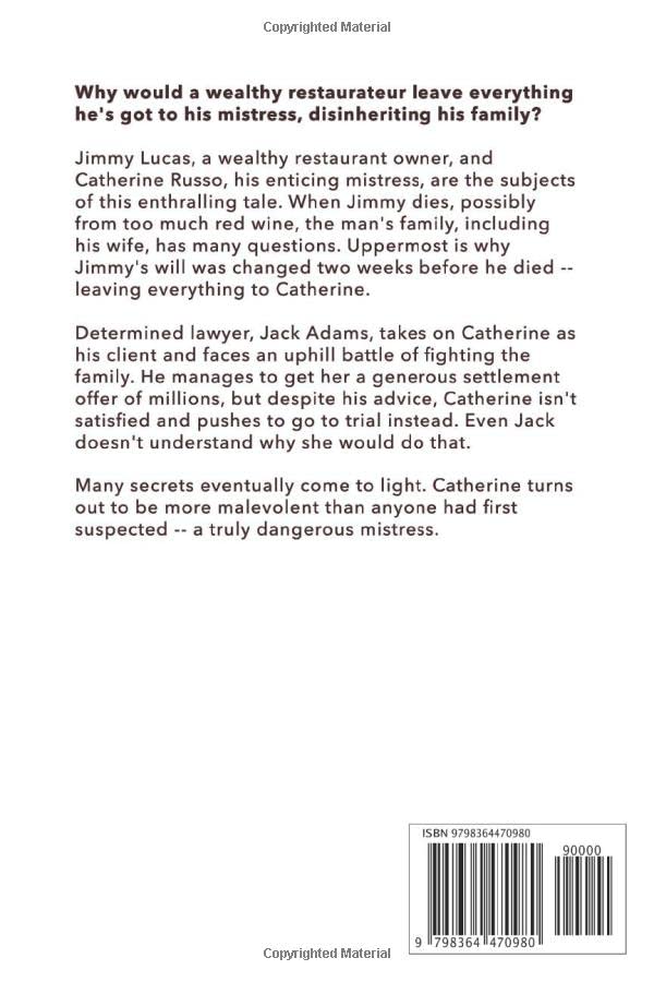 Advogado Ambicioso Luta Contra Um Caso De Propriedade De Alto Risco Para Uma Amante De Luto Contra Uma Família Distante, Mas Quando O Cliente Começa A Sabotar O Caso, Tudo Pode Destruí-lo.(uma Versão Atualizada Agora Disponível E Publicada Em 5 De Dezembro De 2022.)jimmy Lucas, Um Rico Dono De Restaurante, E Catherine Russo, Sua Amante Sedutora, São Os Temas Deste Conto Fascinante. Quando Jimmy Morre, Possivelmente De Muito Vinho Tinto, A Família Do Homem, Incluindo Sua Esposa, Tem Muitas Perguntas. O Mais Importante É O Motivo Pelo Qual O Testamento De Jimmy Foi Mudado Duas Semanas Antes De Morrer - Deixando Tudo Para Catherine.o Advogado Determinado, Jack Adams, Assume Catherine Como Sua Cliente E Enfrenta Uma Batalha Difícil De Lutar Contra A Família. Ele Consegue Que Ela Faça Uma Generosa Oferta De Acordo De Milhões, Mas Apesar De Seus Conselhos, Catherine Não Está Satisfeita E Pressiona Para Ir A Julgamento. Mesmo Jack Não Entende Por Que Ela Faria Isso.muitos Segredos Acabam Vindo À Tona. Catherine Acaba Por Ser Mais Malévola Do Que Qualquer Um Tinha Suspeitado Pela Primeira Vez - Uma Amante Verdadeiramente Perigosa.