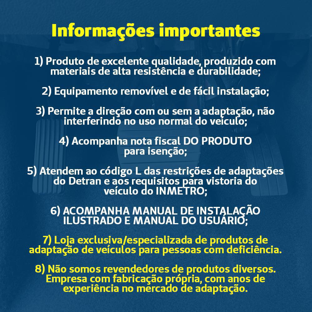 Acelerador À Esquerda/ Inversão De Pedal O Acelerador À Esquerda Ou Inversão De Pedal É Um Equipamento De Adaptação Veicular Para Deficientes Físicos, Que Transfere O Comando Do Acelerador Para O Lado Esquerdo. A Adaptação Permite A Direção Do Veículo Com Ou Sem A Mesma, Através Do Recurso Escamoteável Que Pode Ser Elevado Quando Não Utilizado, Mantendo A Originalidade Do Pedal, Sem Interferências Ou Vestígios De Sua Utilização. Sendo Um Equipamento De Segurança, Possibilita Que O Motorista Possa Frear Ou Acelerar O Veículo Utilizando Somente O Pé Esquerdo. É Indicado Para Condutores Que Possuem Limitações Ou Deficiências No Membro Inferior Ou Em Todo Hemicorpo Direito. Para Voltar A Utilizar O Pedal Basta Acioná-lo Com O Pé, Deixando O Equipamento Na Posição Adequada. Se Adapta Somente Em Veículos Com Câmbio Automático E Pode Ser Instalado Pelo Seu Mecânico De Confiança. Informações Gerais: Equipamento Específico Para Cada Modelo De Carro (consulte Todos Os Anúncios), Fácil Instalação, Não Necessitando De Mão De Obra Especializada, É Recomendado Para Condutores Com Limitações Ou Deficiências Nos Membros Inferiores Ou No Hemicorpo Direito, Destina-se A Veículos Com Câmbio Automático, Atende Ao Código C Das Restrições De Adaptações Do Detran, Equipamento Nacional, Não Deixa Vestígios E/ou Danos Na Instalação Ou Retirada Da Adaptação, Pois Utiliza A Furação Original Do Veículo, Equipamento Com Pedal Escamoteável (pode Ser Ocultado, Quando Não Estiver Em Uso), Design Ergonômico E Discreto, Projeto Exclusivo E Desenvolvido Com Materiais De Alta Durabilidade E Resistência, Vantagem Exclusiva: Único Do Mercado Com 3 Anos De Garantia, Contra Defeitos De Fabricação, Acompanha Instruções De Instalação E Suporte Telefônico Ou Whatsapp, Caso Seja Necessário, Inclusa Nota Fiscal Para Isenção, O Comprador É Responsável Pela Instalação Do Equipamento, Valor Somente Do Produto. Não Abrange Custos Referentes A Documentações Do Detran E Inspeção Junto À Órgãos Credenciados Do Inmetro. Características E Especificações: Marca: Adapterpro, Material: Aço, Tamanho Do Equipamento: L 30 X A 11 X C 40 Cm Peso: 1,500 Kg Garantia: 03 Anos De Garantia Acompanha Nota Fiscal De Compra Do Equipamento, Não Inclusos No Valor Taxas E Demais Despesas De Documentação E Instalação.