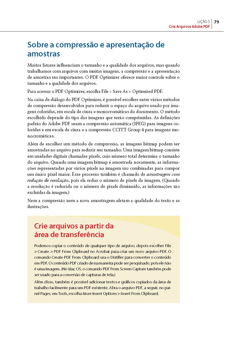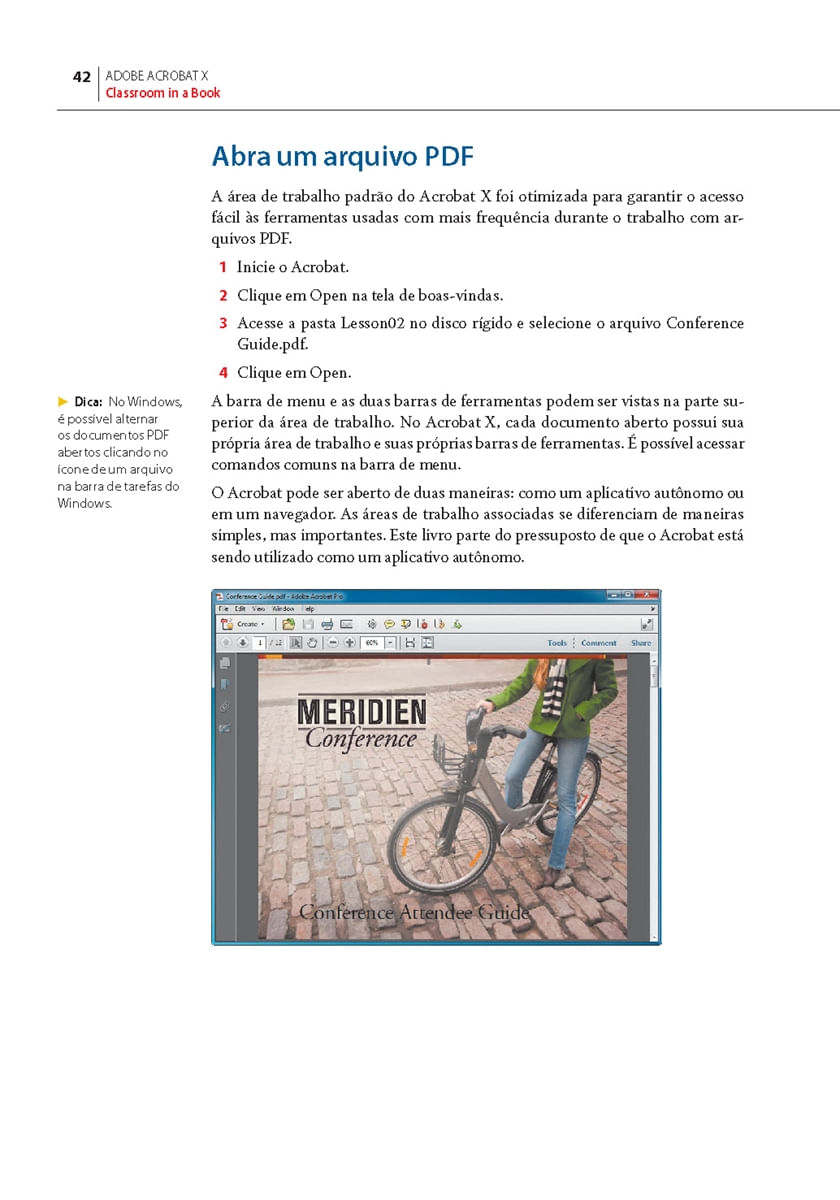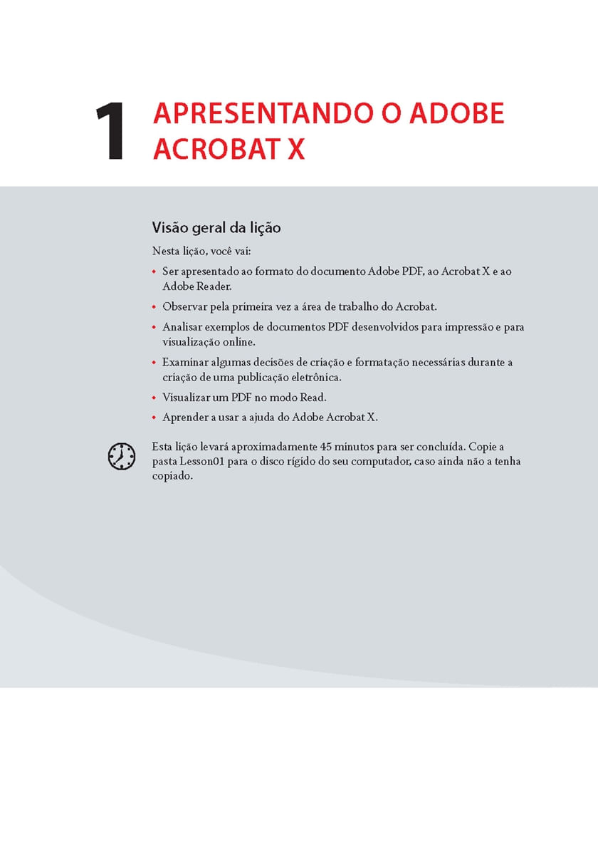 Totalmente colorido, este livro ensina a utilizar os novos recursos do Adobe Acrobat X. Em 13 licoes, o leitor vai aprender a criar arquivos Adobe PDF a partir de qualquer outro arquivo ou documento em papel, a revisar e fazer comentarios em arquivos PDF, a criar e distribuir formularios online interativos, a combinar varios documentos em PDF Portfolios, a incluir videos e animacoes SWF em arquivos PDF, a criar e usar acoes para automatizar os processos, a preparar documentos para impressao de alta qualidade e muito mais. Rapido e didatico, o texto e de facil leitura e o aluno pode aprender no seu proprio ritmo, completando as licoes de acordo com sua necessidade. A obra faz parte da serie Classroom in a Book, guia oficial da Adobe e lider de vendas em livros de treinamento de software.