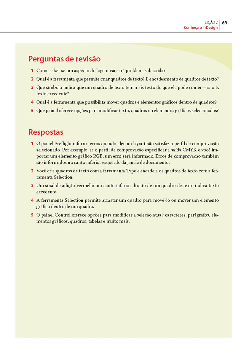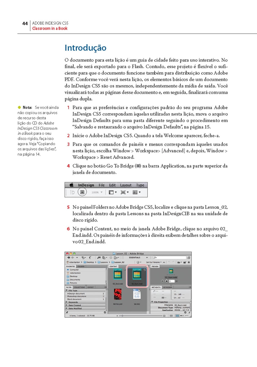 Totalmente colorido, este livro ensina a utilizar os novos recursos do Adobe InDesign CS5. Em 14 licoes, o leitor vai aprender a projetar, comprovar e publicar layouts para revistas, newsletters, catalogos, etc., a fazer documentos interativos complexos, e a exportar como arquivo SWF para visualizar em um navegador com o plug-in do Adobe Flash Player ou como documento PDF interativo e muito mais. Rapido e didatico, o texto e de facil leitura, e o aluno pode aprender no seu proprio ritmo, completando as licoes de acordo com sua necessidade. A obra faz parte da serie Classroom in a Book, guia oficial da Adobe e lider de vendas em livros de treinamento de software.
