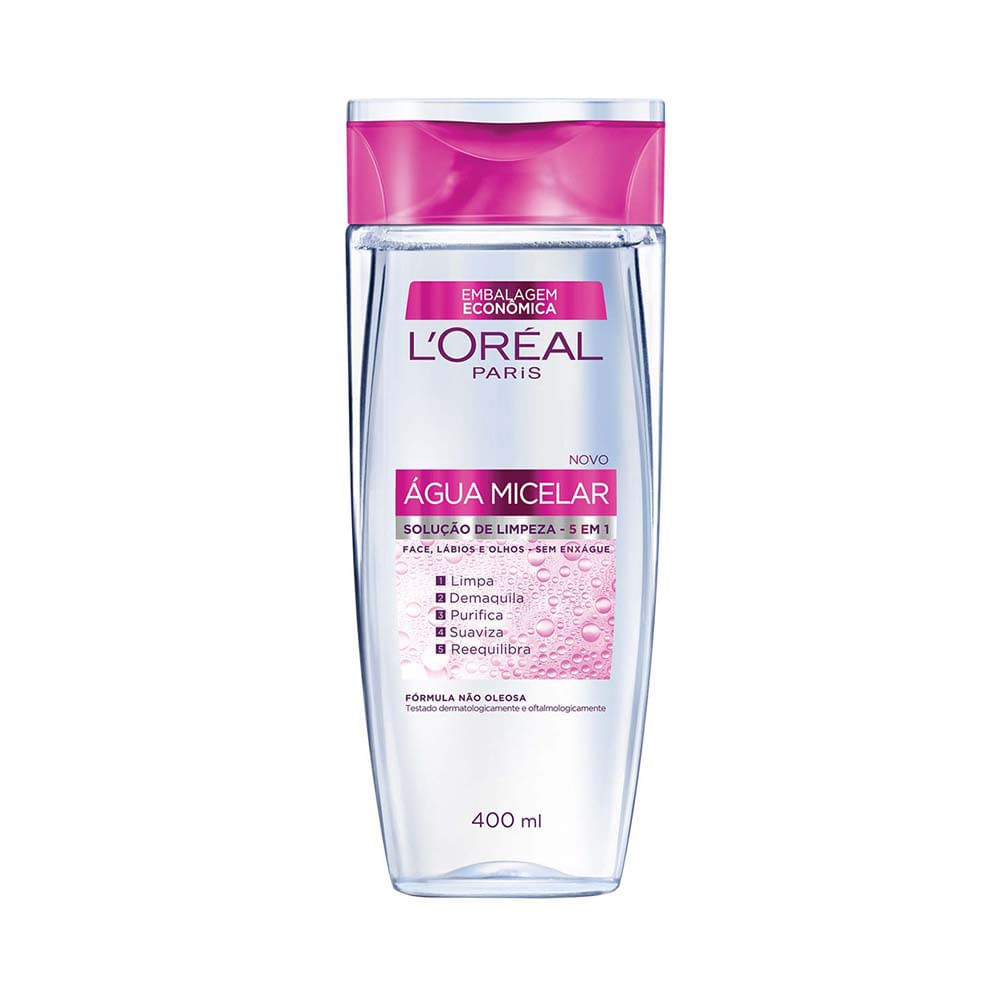 A Á,gua Micelar de L'Oréal Paris foi especialmente desenvolvida para limpar a pele. Limpa, reequilibra, purifica e suaviza até, as peles mais sensí,veis..Com o alto poder de limpeza e purificação, capta e elimina as impurezas e maquiagem, revelando uma pele perfeitamente limpa, reequilibrada e suave..Pode ser usada no rosto, lá,bios e olhos..Sua fó,rmula não oleosa é, composta por partí,culas chamadas de micelas que agem como í,mãs captando e eliminando as impurezas e a maquiagem da face sem agredi-la..Em tamanho viagem, a Á,gua Micelar é, ideal para ser carregada na bagagem ou até, mesmo no né,cessaire do dia a dia.