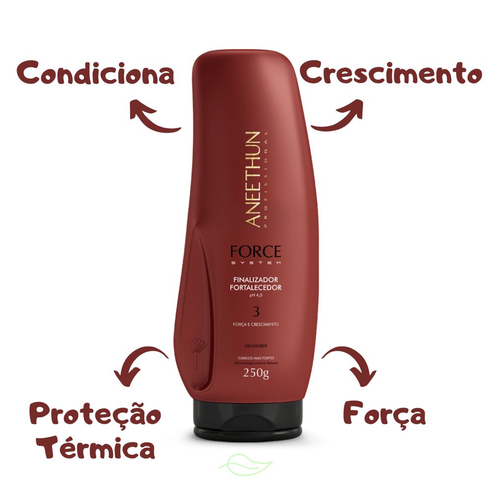 Conteúdo Da Embalagem1- Shampoo Force System Aneethun 300ml1- Máscara Force System Aneethun 250g1- Finalizador Force System Aneethun 250g 1- Creme De Silicone Cachos Aneethun 250gsua Fórmula É Altamente Condicionante, Hidrata, Nutre Profundamente, Devolvendo A Força, O Brilho E A Vitalidade Aos Cabelos. Ph 4,0.diferenciais-impulsiona O Crescimento-evita A Queda-aumenta A Densidade Dos Cabelos-aumenta O Calibre Do Fio-devolve Força, Elasticidade E Resistência-reconstrói A Fibra-hidrata-com Termoproteçãoativosdensifiber: O Mecanismo De Ação Do Densifiber Estimula O Metabolismo Intracelular, Eleva Os Níveis De Trifosfato Atp, Melhora A Vascularização Da Derme, Impulsionando O Crescimento Dos Fios E Evitando A Queda.aminoácidos Vegetais: Promovem Uma Reconstrução Profunda Do Fio Danificado, Aumentando Sua Resistência.tipos De Cabeloenfraquecidos