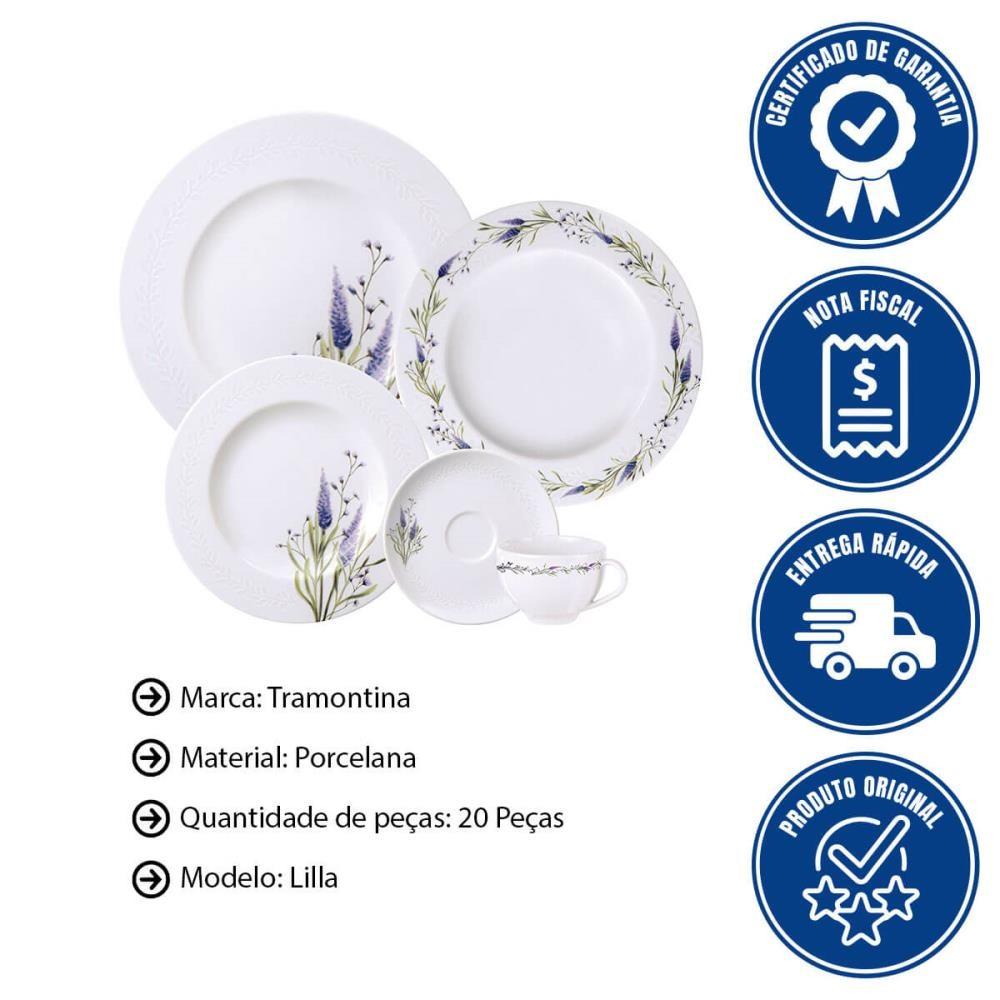 - Transforme Suas Refeições Em Verdadeiros Banquetes De Elegância Com O Aparelho De Jantar Tramontina Lilla.- Composto Por 20 Peças Em Porcelana Decorada, Cada Detalhe Foi Cuidadosamente Elaborado Para Adicionar Um Toque De Sofisticação À Sua Mesa.- Inspirado Na Beleza Das Flores Pintadas À Mão, Esse Conjunto É A Escolha Perfeita Para Quem Busca Criar Momentos Memoráveis Em Família.- Surpreenda-se Com A Qualidade E O Charme Do Tramontina Estilo Flora.- Adquira Já E Encante Seus Convidados Com Uma Experiência Gastronômica Única.aparelho De Jantar Tramontina Lilla Em Porcelana Decorada 20 Peças - 96589052marca: Tramontinamodelo: Lilla 20 Peças 96589/052conteúdo- 4 Conjunto Xícara E Pires 250 Ml - 96580108- 4 Prato Fundo 23 Cm - 96580107- 4 Prato Raso 28 Cm - 96580105- 4 Prato Sobremesa 21 Cm - 96580106descrição Dos Pratos De Porcela Tramontina 20 Peças- Com O Aparelho De Jantar Tramontina Lilla Em Porcelana Decorada 20 Peças Você Tem O Item Perfeito Para Quem Busca Um Estilo Delicado, Atraente E Diferenciado.- Com Sua Inspiração Nas Flores, Essa Coleção Traz Cor E Delicadeza Para Uma Mesa Atemporal.- Afinal, Flores São Sempre Bem-vindas Em Qualquer Estação.- Parte Do Tramontina Estilo Flora, As Peças Trazem Delicadeza Com Decoração Em Baixo Relevo Cuidadosamente Posicionadas.- Com Seu Design Elegante E Detalhes Encantadores, Esse Aparelho De Jantar Vai Encantar Seus Convidados E Transformar Suas Refeições Em Momentos Especiais.- Produzidas Em Porcelana Decorada Tradicional Tramontina, Às 20 Peças Deste Aparelho Incluem Pratos Rasos, Pratos Fundos, Pratos De Sobremesa E Xícaras Com Pires.- Seja Para Uma Ocasião Especial Ou Para O Dia A Dia, Ele É A Escolha Perfeita Para Quem Valoriza Qualidade, Estilo E Sofisticação!informação Dos Pratos De Porcela Tramontina 20 Peças- Fabricado Em Porcelana.- Coleção: Lilla.- Uso: Resistente A Micro-ondas E Lava-louças.- Porosidade Próxima De Zero, Evitando A Proliferação De Fungos E Bactérias.- Composto Por: 20 Peças.- Serviço: 4 Pessoas.orientação Dos Pratos De Porcela Tramontina 20 Peças- Ao Usar O Produto Pela Primeira Vez, Lavar Bem A Peça Com Esponja Macia E Sabão Neutro.- Lavar As Peças Utilizando Esponja Macia E Sabão Neutro.- Não Levar As Peças Ao Forno.- Não Submeter As Peças A Chama Direta.garantia- 90 Dias De Garantia Legal Para Vícios Ou Defeitos De Fabricação.peso- 8.02 Kgdimensões- Dimensões Da Embalagem (compr. X Larg. X Alt.): 290 X 230 X 365 Mm.perguntas Frequentes:1. Quantas Peças Compõem O Aparelho De Jantar Tramontina Lilla Em Porcelana Decorada?este Aparelho De Jantar É Composto Por 20 Peças, Incluindo Conjuntos De Xícaras Com Pires, Pratos Rasos, Pratos Fundos E Pratos De Sobremesa.2. Qual É A Inspiração Por Trás Do Design Do Conjunto Tramontina Lilla?o Conjunto Tramontina Lilla É Inspirado Na Beleza Das Flores, Trazendo Cor, Delicadeza E Um Toque De Sofisticação Para A Sua Mesa.3. Quais São Os Cuidados Recomendados Para Preservar A Qualidade Das Peças?recomenda-se Lavar As Peças Com Esponja Macia E Sabão Neutro, Evitando O Uso De Abrasivos. Elas São Resistentes A Micro-ondas E Lava-louças, Porém Não Devem Ser Levadas Ao Forno Ou Expostas À Chama Direta.4. Qual É A Garantia Oferecida Para O Aparelho De Jantar Tramontina Lilla?o Conjunto Possui Uma Garantia Legal De 90 Dias Para Possíveis Vícios Ou Defeitos De Fabricação.5. Para Quantas Pessoas O Aparelho De Jantar Tramontina Lilla É Indicado?este Aparelho É Ideal Para Servir Até 4 Pessoas, Tornando-o Perfeito Para Ocasiões Especiais Ou Para Uso Diário Com A Família.