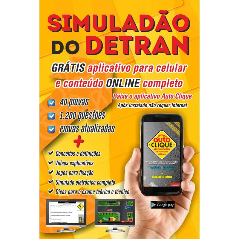 Preparatório para prova de primeira habilitação, do detran..Acompanha – chave de acesso para o aplicativo de estudos da auto clique..Conteúdos abordados nas provas.- processo de habilitação: 2 provas.- infrações e crimes de trânsito e suas punições: 2 provas.- sinalização de trânsito: 2 provas.- normas de circulação e conduta: 2 provas.- direção defensiva: 2 provas.- primeiros socorros: 2 provas.- cidadania e meio ambiente: 1 provas.- noções de mecânica e manutenção preventiva de veículos de 2 e 4 rodas: 1 provas.- matéria toda: 23 provas..Material produzido pela editora auto clique e assinado pelo professor ronaldo cardoso, maior especialista em trânsito do brasil.