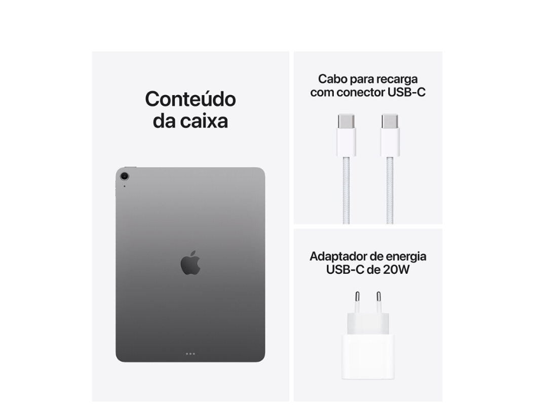 Itens inclusos Ipad Air Cabo Para Recarga Com Conector Usb-c (1 Metro) Adaptador De Energia Usb-c De 20w