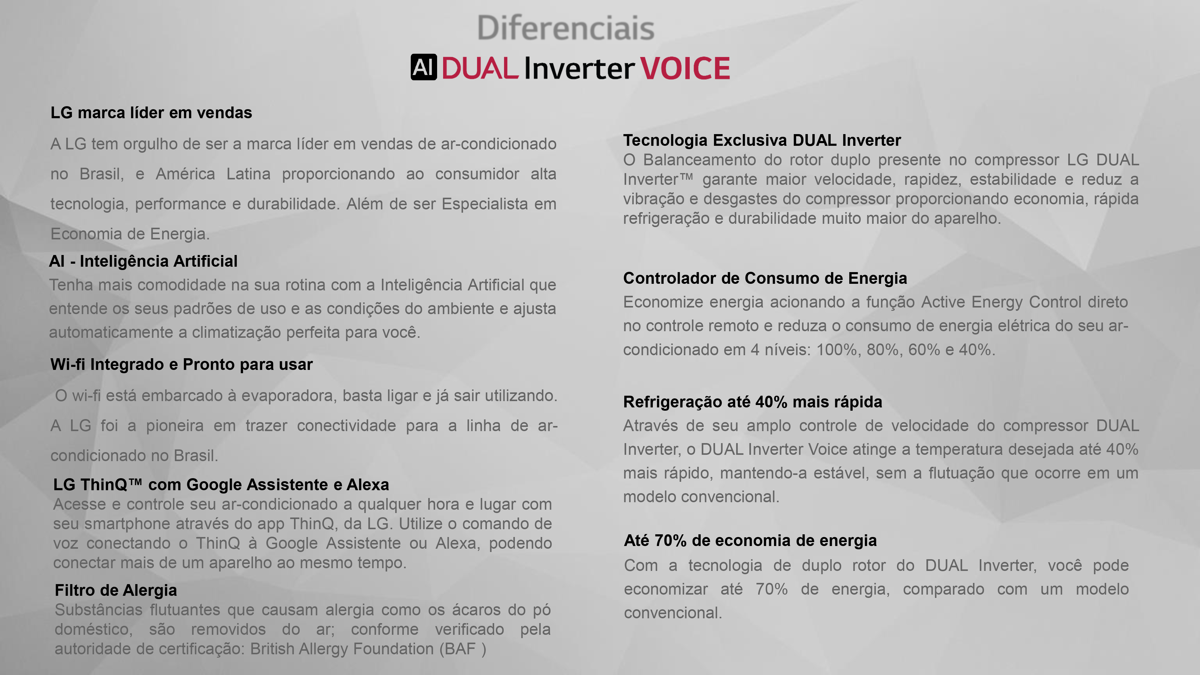 com O Sistema Dual Inverter, O Aparelho Oferece Resfriamento Rápido, Silencioso E Com Até 70% De Economia De Energia, Mantendo A Temperatura Estável E Agradável O Tempo Todo. E Com A Inteligência Artificial Voice Ai.