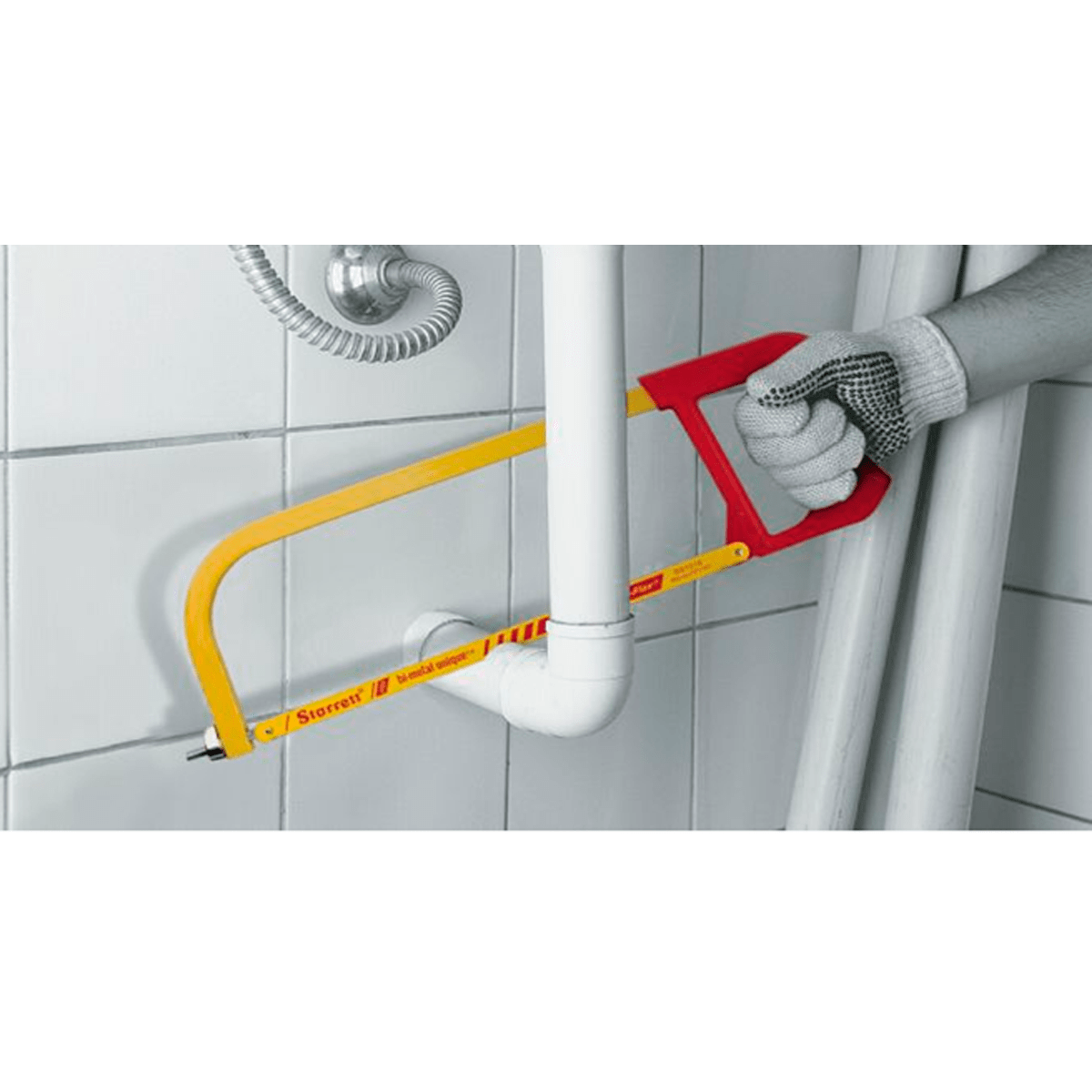 Arco de Serra K140 Categoria Starrett Compacto e resistente, o arco K140 é a melhor ferramenta para executar serviços em locais de difícil acesso. Um arco mais leve permite que o usuário efetue cortes mais rápidos e precisos, em especial nos ambientes que dificultam o desenvolvimento do trabalho. Ideal para profissionais autônomos como pedreiro, encanador e eletricista. Possui cabo com empunhadura anatômica, otimizando o esforço empregado na operação de corte. Melhor para o profissional, que emprega menos esforço e ainda prolonga a vida útil da sua lâmina de serra Starrett. Características Leve, compacto e resistente. Arco em aço tubular. Cortes de até 89mm (3.1/2”) de profundidade. Este arco é fabricado com tecnologia inovadora, pois uma peça de Zamac é sobreinjetada no cabo plástico para garantir maior resistência, robustez e permitir que o conjunto permaneça leve, um diferencial e tanto, especialmente nas operações de corte de difícil acesso. Cabo anatômico, fechado, de plástico resistente assegura comodidade e firmeza no manuseio. Projetado para serras de 300mm, cuja tensão se dá por uma porca borboleta localizada na parte frontal do arco, facilitando o tensionamento da lâmina.