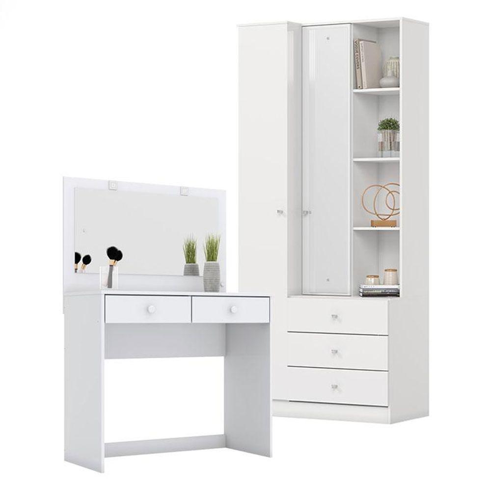 Deixe seu cantinho de beleza ainda mais completo com este lindo kit que preparamos para você. Apresentamos o Armário Multiuso Doha e a Penteadeira Daila com Led , desenvolvidos pela Henn. Multiuso com espelho, 2 portas, puxadores pontuais, combinando perfeitamente com a Penteadeira Daila, que possui Led, 2 gavetas com corrediças metálicas e design moderno. Confira mais detalhes e aproveite!