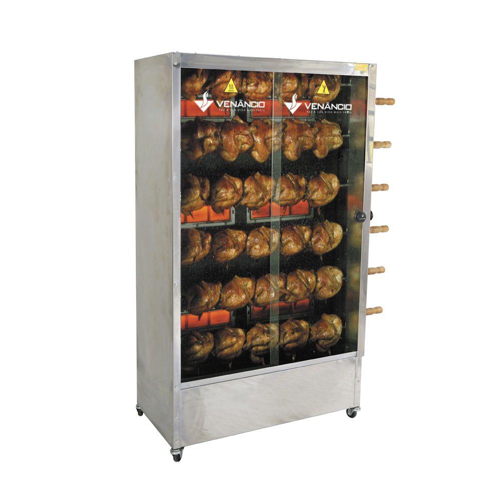 Assador para 30 Frangos Venâncio Certificado pelo INMETRO, o Assador a Gás para Frango SGF3 da Venâncio possui características que permitem assar frangos e outros tipos de alimentos com segurança, economia e praticidade. Através de um sistema eficaz de queimadores infravermelhos, o frango fica assado por igual, deixando o frango assado por igual. Por meio do isolamento térmico em lã de rocha, a temperatura se mantém alta com o mínimo de gasto de luz e gás. Graças ao seu acabamento externo em aço inox AISI 430, o equipamento tem alta resistência contra ferrugens geradas por gordura e água. E para descomplicar o deslocamento, o Assador SGF3 conta com rodízios com travas. Assim, seu maior trabalho será de fazer clientes. Informações Técnicas Modelo: SGF3 Certificado pelo Inmetro Portaria 371/09 Bivolt com chave seletora Motor 1/4 CV Consumo de energia: 0,19 kWh Assador a Gás GLP Consumo de gás: 1,590 kg/h Acabamento externo em aço inox AISI 430 Isolamento térmico em lã de rocha Capacidade para até 30 frangos Sistema de queimadores infravermelhos Peso: 103,00 kg Medidas Altura: 167,50 cm Largura: 90,00 cm Profundidade: 46,00 cm