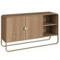 O design do móvel é moderno e funcional, apoiado em pés metálicos em cor dourada. O contraste entre o acabamento do Mdf e a estrutura metálica adiciona sofisticação e leveza ao móvel, que se encaixa bem em diferentes estilos de decoração.
