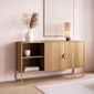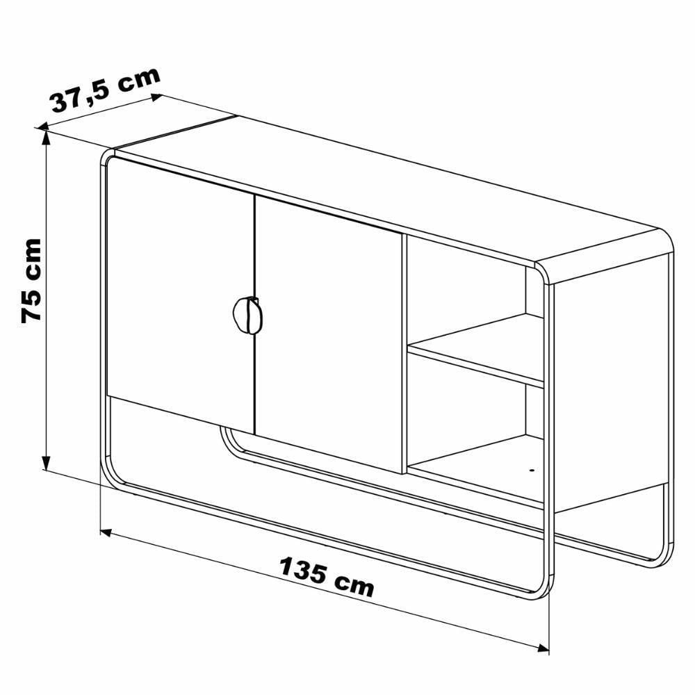 Para a organização, o balcão possui 2 portas que abrem para um amplo espaço interno, com prateleiras que criam nichos internos. Além disso, a peça se diferencia pelos nichos externos abertos, perfeitos para exibir objetos de decoração, livros, caixas organizadoras ou até mesmo um aparelho de som. Os puxadores redondos, que combinam com a cor dos pés, completam o visual minimalista e elegante do buffet.