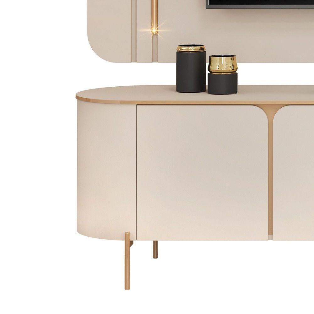 Bancada E Painel Para Tv Até 75 Polegadas 3 Portas Ariana Off White- Mabe Magazine Bancada E Painel Para Tv Ariana - Mabe Magazine- Revolucione Sua Sala De Tv Com Luxo E Conforto Da Bancada Ariana. Mais Do Que Um Simples Móvel, Ele É Uma Verdadeira Declaração De Bom Gosto E Sofisticação. Com Um Design Que Harmoniza De Maneira Sublime O Clássico E O Contemporâneo, A Bancada Ariana É A Escolha Perfeita Para Quem Busca Uma Peça Que Traga Personalidade E Requinte Ao Ambiente. Seu Acabamento Impecável E Seus Materiais De Altíssima Qualidade Garantem Uma Durabilidade Excepcional, Além De Proporcionar Um Conforto Incomparável. Viva Momentos De Relaxamento E Elegância Em Sua Sala De Tv, A Peça Que Vai Elevar O Padrão De Estilo E Aconchego Em Sua Casa. Não Deixe Essa Oportunidade Passar - Adicione Um Toque De Exclusividade À Sua Sala Adquirindo A Sua Agora Mesmo!características:- Largura: 241 Cm,- Altura: 190 Cm,- Profundidade: 45 Cm,- Fabricado Em Mdf,- 3 Portas Em Mdf,- Suporta Tv Até 75 Polegadas,- Bancada Com Cantos Arredondados,- Pés De Metal,- Prateleira De Vidro 6 Mm,- Painel Com Frisos Decorativos E Luminárias Led Na Cor Dourada,- Nicho Com Prateleira De Vidro,observações:- Limpar Com Flanela Limpa E Seca. Não Molhar O Móvel E Não Expor Em Lugar Úmido Ou Próximo De Fontes De Calor. Não Usar Produtos Abrasivos,- As Imagens Ambientadas São Meramente Ilustrativas E Podem Apresentar Itens Que Não Compõe O Produto,- Objetos Decorativos Que Aparecem Na Foto Não Acompanham O Produto,- As Cores Do Produto Podem Variar De Acordo Com O Monitor, A Iluminação Do Ambiente, Ou Sua Percepção Visual,- Confira As Dimensões Antes Da Compra E Certifique-se De Que O Produto Passará Por Elevadores, Portas E Corredores, Já Que Nossa Entrega Não Inclui A Subida De Lances De Escada, Ou O Içamento De Produtos,- Produto Para Uso Residencial Em Ambiente Interno, Não Devendo Ficar Exposto Diretamente Ao Sol, Calor E Umidades Excessivas.
