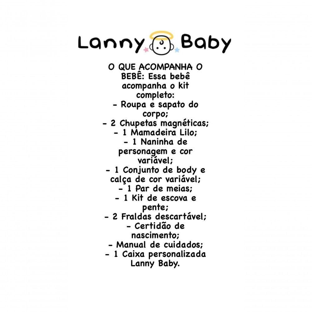 Bebê Reborn Aurora - Kit Completo Corpo Do Bebê Tecidosobre O Bebê: Essa Bebê Possui Pintura Realista, Detalhes Encantadores Que Simulam A Pele De Um Bebê De Verdade, Como: Palma Da Mão E Ponta Dos Dedos Rosados, Manchinhas De Frio, Veias, Sobrancelha Pintada Fio A Fio, Cílios E Cabelo Enraizados Fio A Fio.ela Possui Tamanho E Peso Semelhantes Ao De Um Bebê Real! Aproximadamente 50cm E Peso Aproximado De 2kg.o Pescoço Da Bebê É Fixo (não Movimenta Para Os Lados)!escolha Do Corpo: Bebê Com Corpo Em Vinil: Pode Dar Banho. Ela Possui O Corpo E Os Membros Em Vinil.bebê Com Corpo Em Tecido: Não Pode Dar Banho. Ela Possui Corpo Em Tecido E Membros Em Vinil.o Que Acompanha O Bebê: Essa Bebê Acompanha O Kit Completo:- Roupa E Sapato Do Corpo,- 2 Chupetas Magnéticas,- 1 Mamadeira Lilo,- 1 Naninha De Personagem E Cor Variável,- 1 Conjunto De Body E Calça De Cor Variável,- 1 Par De Meias,- 1 Kit De Escova E Pente,- 2 Fraldas Descartável,- Certidão De Nascimento,- Manual De Cuidados,- 1 Caixa Personalizada Lanny Baby.
