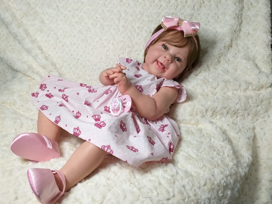 BEBÊ REBORN REALISTA PRONTA ENTREGA Corpo : tecido macio (SUEDE) excelente qualidade, Acompanha enxoval igual ao da foto. Toda a roupinha, chupetas e acessórios são de muito bom gosto e de primeira qualidade. Cílios de verdade, Olhos azuis ( você pode escolher verde ou castanho também) Membros inteiros de vinil siliconado. Cabelo: implantado fio a fio, pode molhar, Peso: 2 kg aproximado Medida:55 cm Pintura: aplicada toda a técnica reborn, manchinhas arroxeadas, manchinhas de frio, veinhas aparentes, unhas francesinha, marquinha de vacina e marquinha do teste do pezinho. O QUE ACOMPANHA A BONECA 1 Vestidinho (pode ser diferente a da foto porem da mesma, qualidade) 1 Sapatinho 1 Faixa de cabelo 1 Escova 1 Pente 1 Par de brincos 2 Fraldas 1 Chupeta magnética 1 Mamadeira com leite falso 1 Certidão de nascimento 1 Teste do pezinho 1 Manual de cuidados 1 Caixa Tire todas as suas dúvidas antes da compra. Estou sempre à disposição para atendê-los.