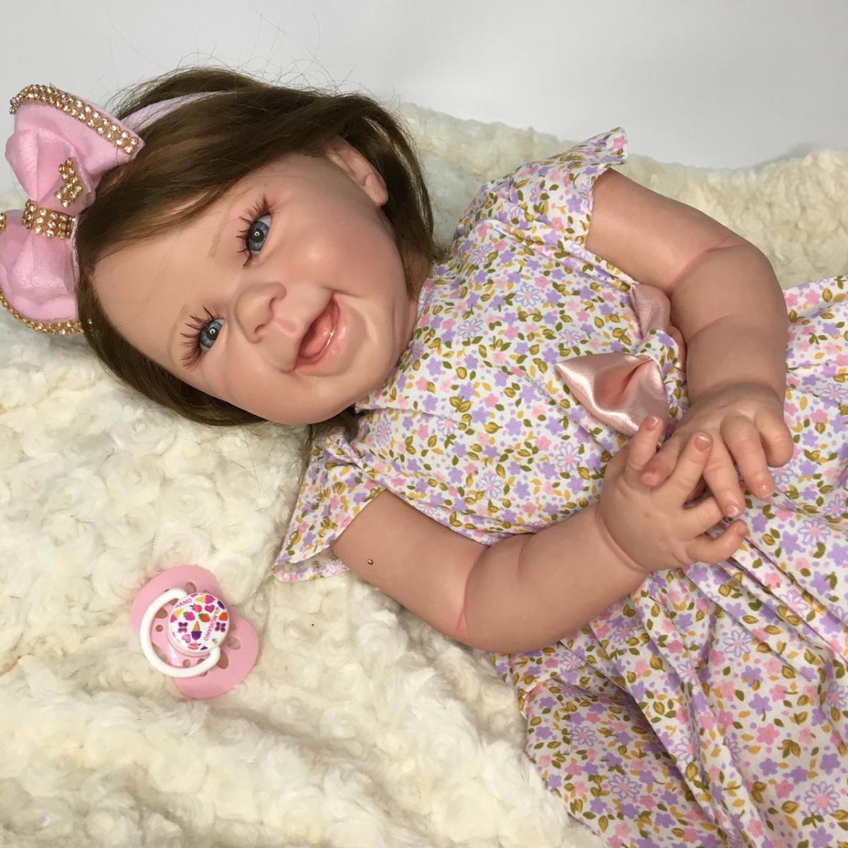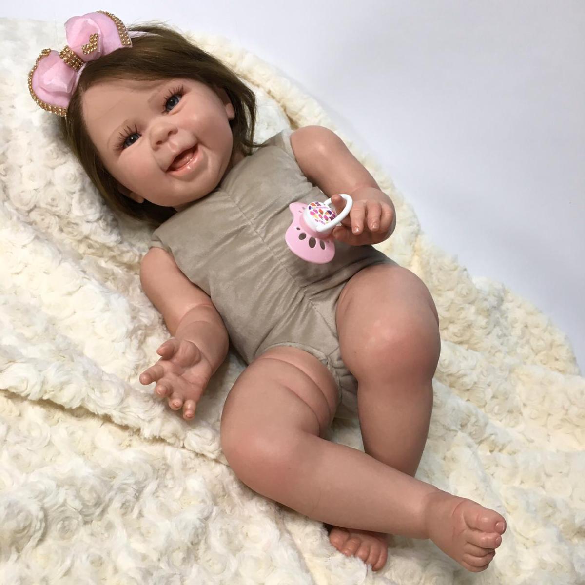 BONECA REBORN REALISTA PRONTA ENTREGA Bebê com corpo em Tecido (suede) excelente qualidade, Ela pode sentar, deitar, levantar os braços e fazer de um tudo o que a sua imaginação mandar, mas cuidado ela não pode tomar banho hein! Ela acompanha enxoval, igual ao da foto. A roupa, chupeta e acessórios são de qualidade e garantimos eficiência no uso. Cílios implantados de verdade. Olhos azuis (você também pode escolher entre verde ou castanho) Membros inferiores e superiores (braços e pernas) inteiros de vinil siliconado. Cabelo: implantado fio a fio (esse tipo de cabelo você pode molhar, tranquilamente) Peso: 2 kg aproximado Pedida: 55 cm Pintura: aplicada toda a técnica reborn, manchas arroxeadas e de frio, veias aparentes, unhas no estilo “francesinha”, marca de vacina e do teste de pezinho. O QUE ACOMPANHA A BONECA · 1 Vestido (pode ser diferente, porém, da mesma qualidade), · 1 Sapatinho, · 1 Faixa de cabelo, · 1 Escova, · 1 Pente, · 1 Par de brincos, · 2 Fraldas, · 1 Chupeta magnética, · 1 Mamadeira com leite falso, · 1 Certidão de nascimento, · 1 Teste do pezinho, · 1 Manual de cuidados, · 1 Caixa. Você pode tirar todas as suas dúvidas antes da compra. Estamos sempre à disposição para conversar e atendê-los.