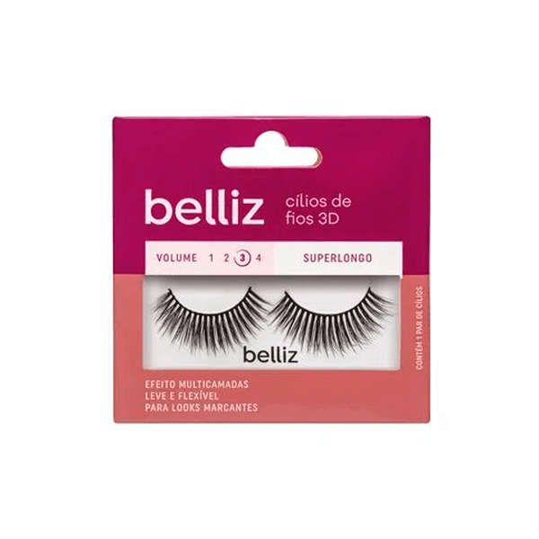 Os cilios Belliz são perfeitos para deixar seu olhar incrível! Modo de uso: Com o auxílio de uma pinça, retire com cuidado os cílios da embalagem. Ajuste o comprimento de acordo com o tamanho de sua pálpebra. Aplique a cola na base dos cílios postiços e aguarde alguns minutinhos. Coloque os postiços rente a raiz dos naturais e pressione. Para remover aplique demaquilante bifásico. Composição: Fios naturais e nylon Volume 3: Superlongo Efeito: Multicamadas