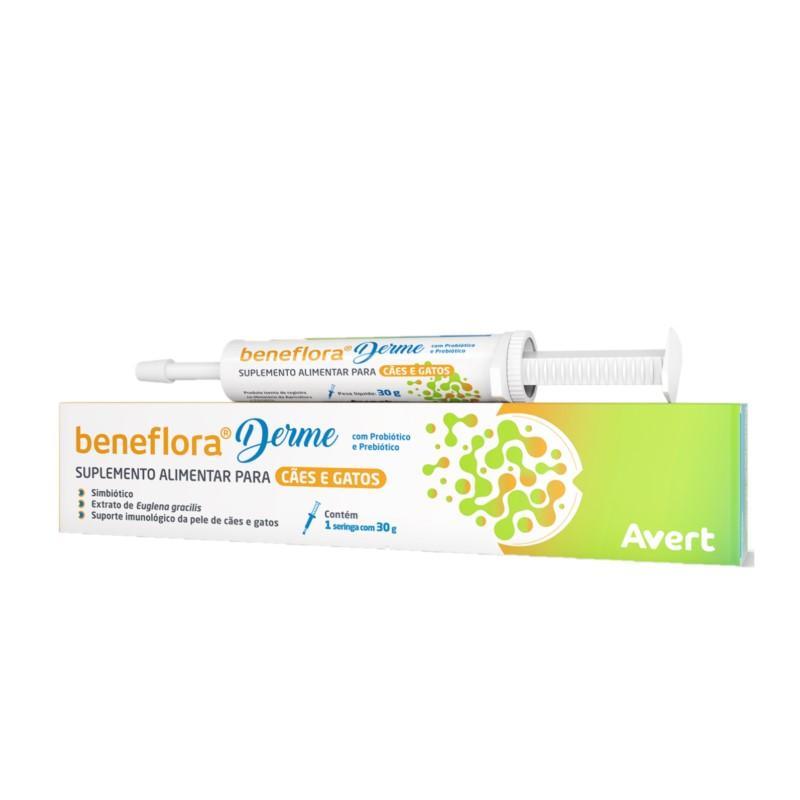 Beneflora Derme É Um Suplemento Alimentar Composto Por Extrato De Euglena Gracilis, Indicado Para O Suporte Imunológico Da Pele De Cães E Gatos, Associado Com Probióticos Que Auxiliam No Equilíbrio Da Microbiota Intestinal.