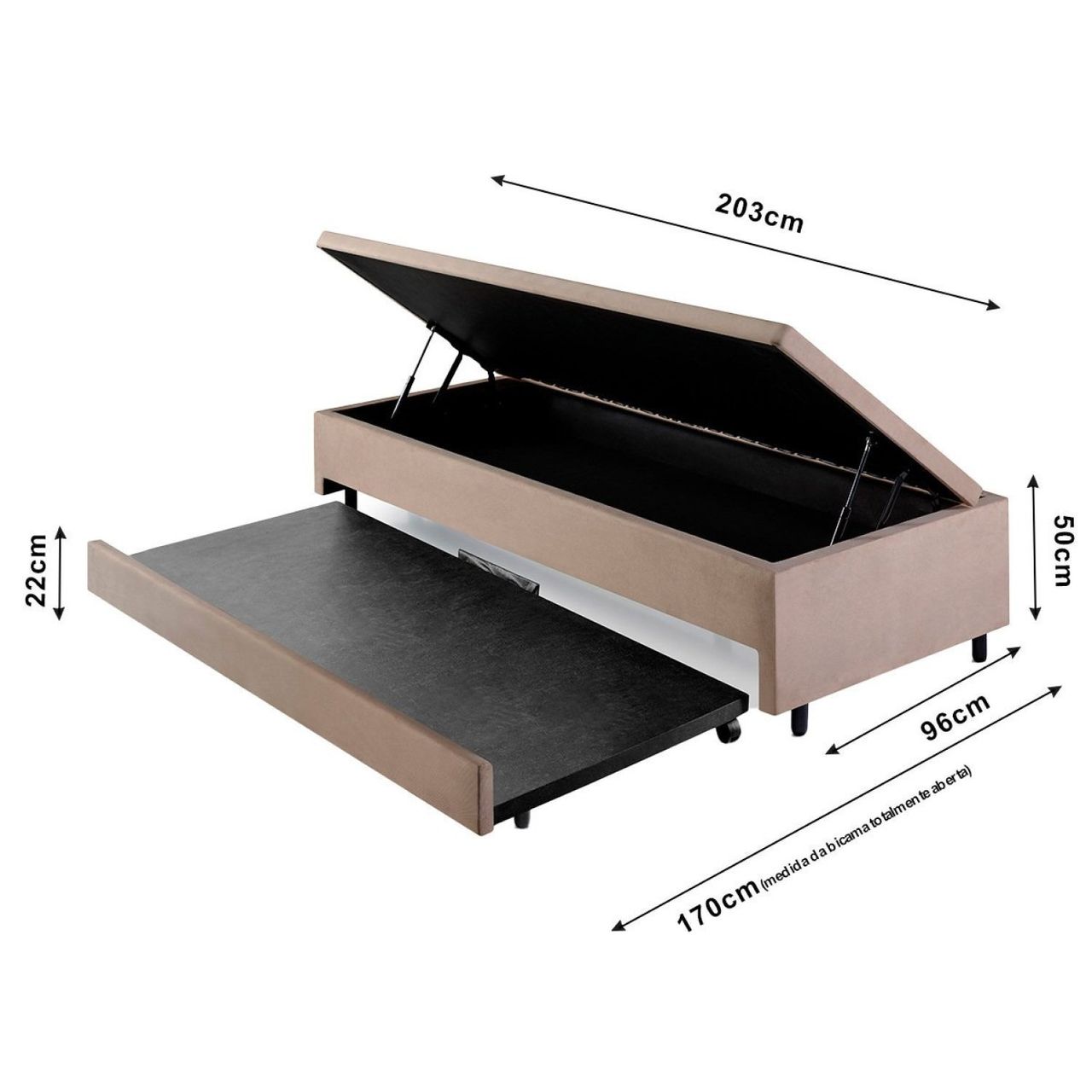Bicama: Sim | Peso (kg): 45 | Garantia: 03 Meses | Altura (cm): 50 | Largura (cm): 96 | Possui Baú: Sim | Cantoneiras: Não | Altura Dos Pés: 8 | Possui Rodízio: Sim | Suporta Até (kg): 300 | Profundidade (cm): 203 | Material Dos Pés: Madeira | Serviço Montagem: 114259443 | Origem Do Produto: Nacional | Ambiente Principal: Quarto | Acompanha Cama Auxiliar: Sim | Revestimento Da Base Box: Suede | Fabricante: B&g | Marca: B&g | Cor: Bege | Cor Do Produto: Bege | Itens Inclusos: 1 Bicama, 1 Kit De Pés, 1 Alça De Apoio E Manual De Instrução De Montagem | Cor Predominante: Bege | Tamanho Do Produto: Solteirão