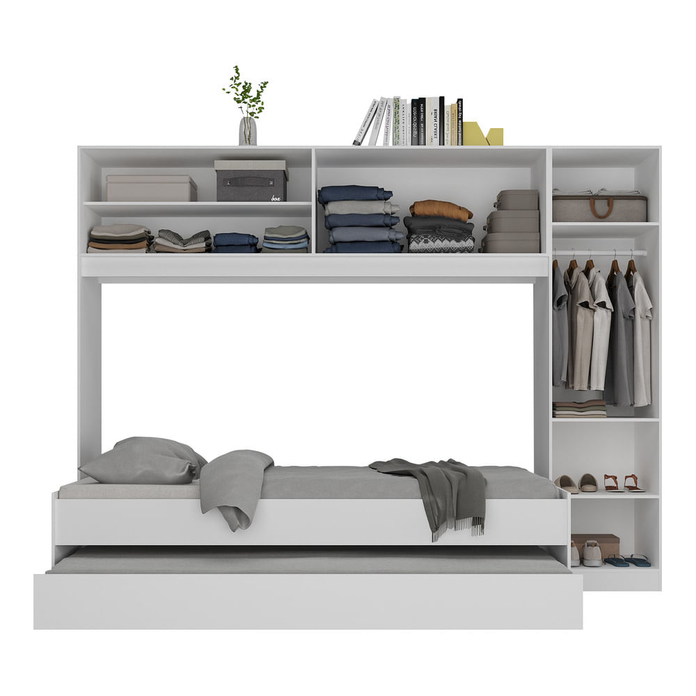 A Bicama com Colchão Incluso e Guarda-Roupas/Roupeiro Multimóveis é produzida em MDP com acabamento em pintura UV, garantindo durabilidade e resistência. A bicama conta com barras em MDF e lastro em madeira, garantindo estabilidade e conforto durante o sono, suporta até 90kg na cama principal e até 60kg na cama auxiliar (possui rodízios que facilitam sua movimentação). Para acrescentar conforto, acompanha colchão D23 com tratamento antiácaro e antialérgico que proporciona noites de sono mais saudáveis e tranquilas. Com puxadores em ABS e cabideiro metálico, o guarda-roupas conta com 1 porta lateral, 2 portas basculantes superiores e prateleiras internas, possuindo amplo espaço interno para acomodar roupas e acessórios e permitindo uma organização impecável para o seu quarto. Versátil, a porta lateral pode ser montada dos dois lados - esquerdo ou direito. Com um design moderno e funcionalidade ímpar, este conjunto é ideal para quem busca praticidade e estilo.