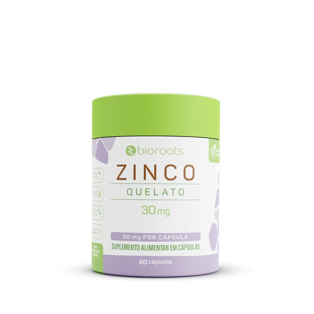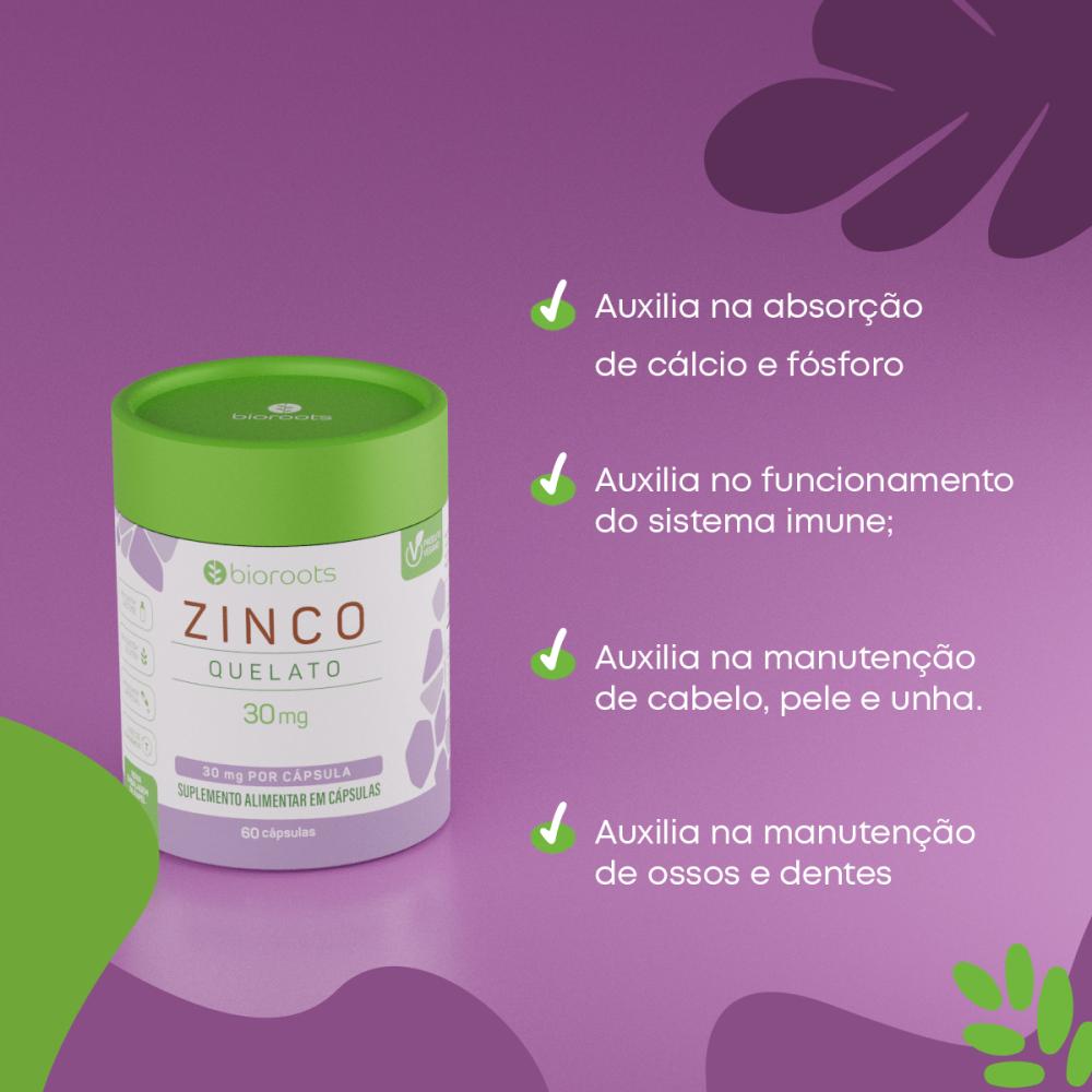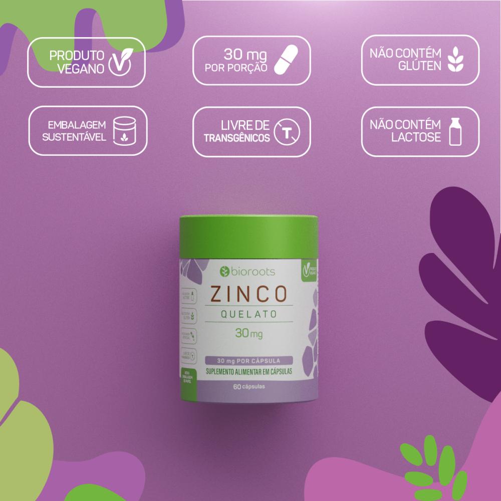O Zinco Quelato Bioroots é um suplemento alimentar em cápsulas, com 30mg por dose , garantindo a dosagem máxima permitida pela Anvisa, equivalente a 214% do Valor Diário Recomendado .