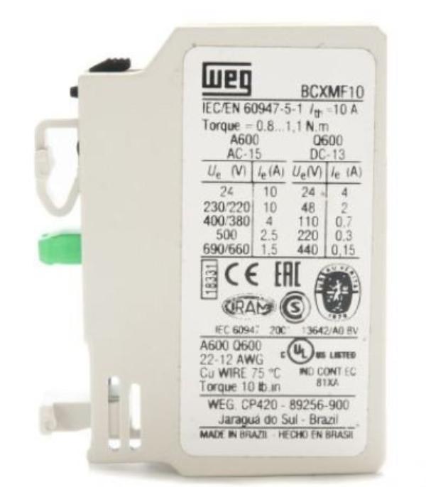 Bloco de Contato Auxiliar BCXMF - WEG 1NF - Bloco de Contato Auxiliar BCXMF - WEG.. BLOCO DE CONTATO AUXILIAR CONTATOR MODELO CWM..MODELO: BCXMF ..CARACTERÍSTICAS..ATENÇÃO: Este produto é um acessório para os Contatores CWM 9...105 - Somente venda avulsa. Não é vendido montado no disjuntor...Contatores WEG.Os contatores WEG apresentam alta tecnologia, representando segurança e facilidade de instalação e manutenção. Possuem alternativa de contatos auxiliares fixos ou através de blocos aditivos...Bloco de Contatos Auxiliares Frontais (Conforme EN 50005 e EN 50012).BLOCOS CONTATO BCXMF01 e BCXMF10.Aplicação: Para contator CWM.Faixa corrente contator 9...105 A.Posição montagem Frontal.Tensão emprego / isolação Ui max=660/690 Volts.Tipo terminal Com parafuso..Características Gerais do Produto:.. Aplicação: Para contator CWM. Faixa corrente aplicação: 9...105 A. Tensão de Emprego: Ui max=660/690 Volts. Posição montagem: Frontal. Dimensões (mm) / Peso (g): 40 (A) x 5 (L) x 30 (C) - Aproximadamente 16gr..Acompanha o produto:.. 10 Blocos de Contato Auxiliar. 1 Manual de Instalação Prático..Garantia:.. 3 meses com a loja