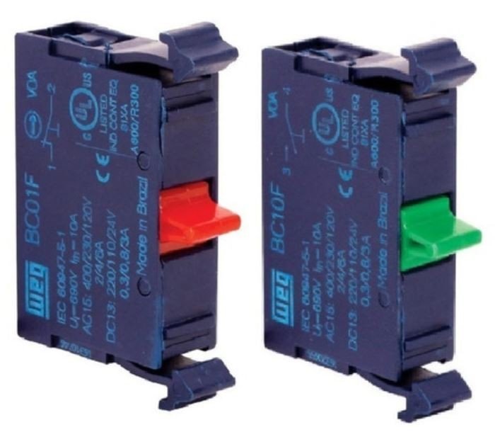 Bloco de Contato BC CSW - WEG 1NF (F) - Bloco de Contato BC CSW - WEG.. BLOCO DE CONTATO..MODELO: CSW.CARACTERÍSTICAS..Comando de Sinalização Linha CSW.A linha de Comando e Sinalização CSW foi cuidadosamente desenvolvida para atender às necessidades de controle e comando elétrico e sinalização nas mais variadas aplicações industriais..Todos os itens da linha foram projetados e possuem desempenho em conformidade com as normas IEC 60947-5-1 (CE) e UL 508 (EUA e Canadá), permitindo a sua aplicação em máquinas e painéis elétricos, com destino aos mais exigentes mercados de todo o mundo..Sistema de Montagem Front-Back e os Novos Blocos de Contato.Através de garras de conexão especiais, os blocos de contato podem ser montados de forma sobreposta entre si (montagem front-back). Esta nova forma de montagem possibilita maior flexibilidade na combinação de contatos e redução de itens de estoque, pois elimina a necessidade de utilização de blocos de contatos duplos..Para a montagem sobreposta de blocos de contato deve-se utilizar a flange AF3F ou AF5F. Os novos blocos de contato que permitem montagem sobreposta são facilmente identificados dos blocos tradicionais pelo seu novo formato e pela cor azul. As flanges AF3F e AF5F são facilmente identificadas pela cor azul...Acessórios - Montagem em Flange.Blocos de Contatos Simples.Contatos - 1 NA (F) ou 1NF (F) ou 1NF.Flange Compatível - AF3F/AF5F.OBS: Não compatível com as caixas plásticas PBW...Características Gerais do Produto:.. Aplicação: Comando e sinalização CSW. Potência: Potência dissipada (W): 0.09. Tensão: Tensão de isolação: Até 1000 V. Dimensões (mm) / Peso (g): 30 ou 35(A) x 5 (L) x 20 (C) - Aproximadamente 15gr..Acompanha o produto:.. 1 Bloco de Contato linha CSW..Garantia:.. 3 meses com a loja