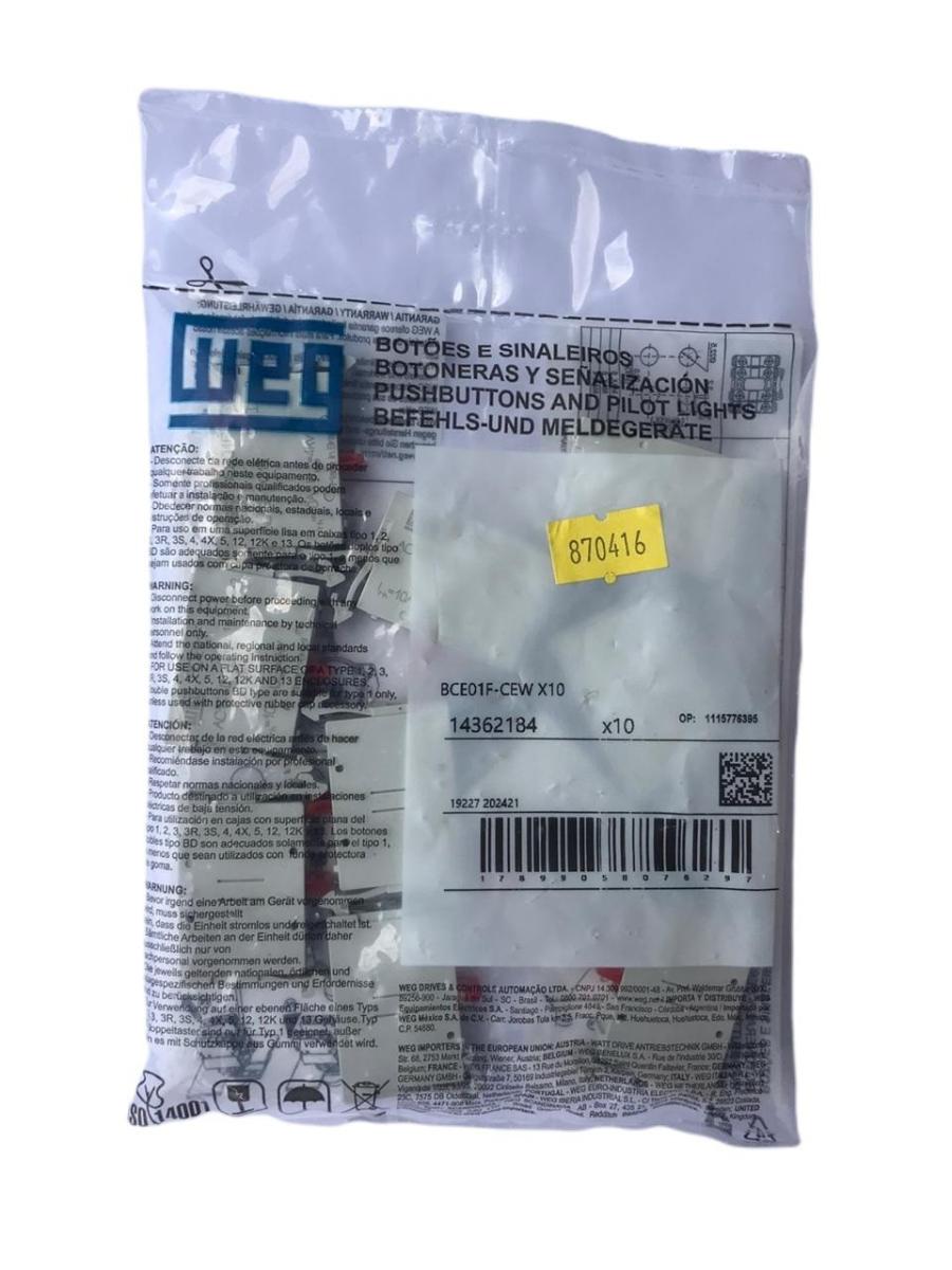 Bloco de Contato Simples - CEW- WEG 1NF (01F) - Bloco de Contato Simples - CEW- WEG.. BLOCO DE CONTATO SIMPLES..MODELO: CEW..CARACTERÍSTICAS..Projetada em conformidade com a norma IEC 60947-5-1, a linha de Comando e Sinalização CEW foi desenvolvida para aplicações gerais nos ambientes industriais. É uma linha modular que apresenta um sistema de montagem rápida e fácil com apenas um clique, dispensando a utilização de ferramentas...A montagem dos blocos auxiliares é feita de forma sobreposta entre si, o que permite um maior número de circuitos e redução de espaço no painel elétrico. Os blocos auxiliares da linha, também são autolimpantes, garantindo melhor condutividade elétrica ao circuito mesmo em aplicações de baixo consumo de energia...Características Gerais do Produto:.. Potência: Dissipada: 0,09 (W). Tensão: Até 1000 V. Aplicação: Comando sinalização econômica. Dimensões (mm) / Peso (g): De cada peça: 30 (A) x 20 (L) x 5 (C) / Aproximadamente 0,15 g..Acompanha o produto:.. 1 pacote com 10 unidades..Garantia:.. 3 meses com a loja