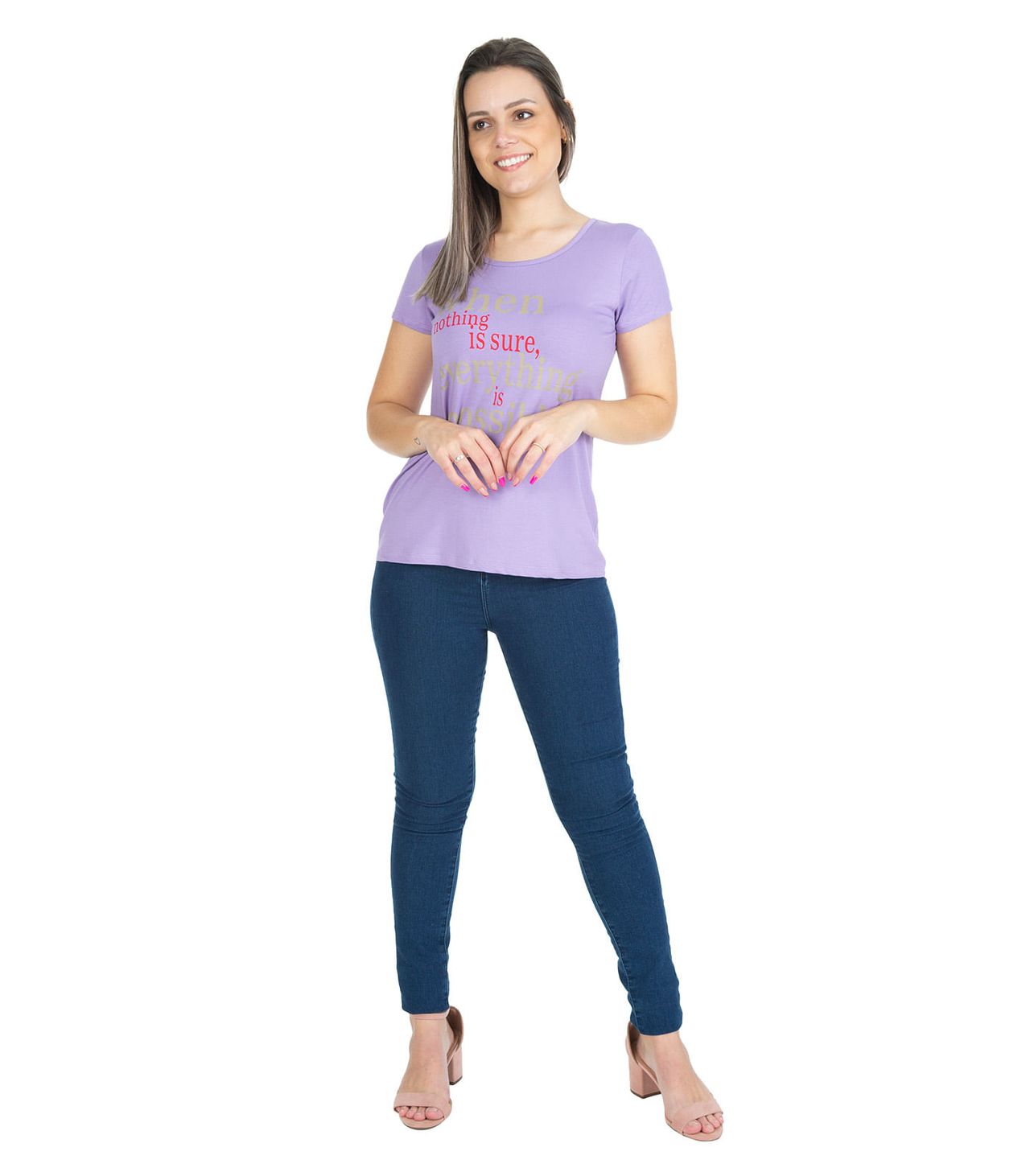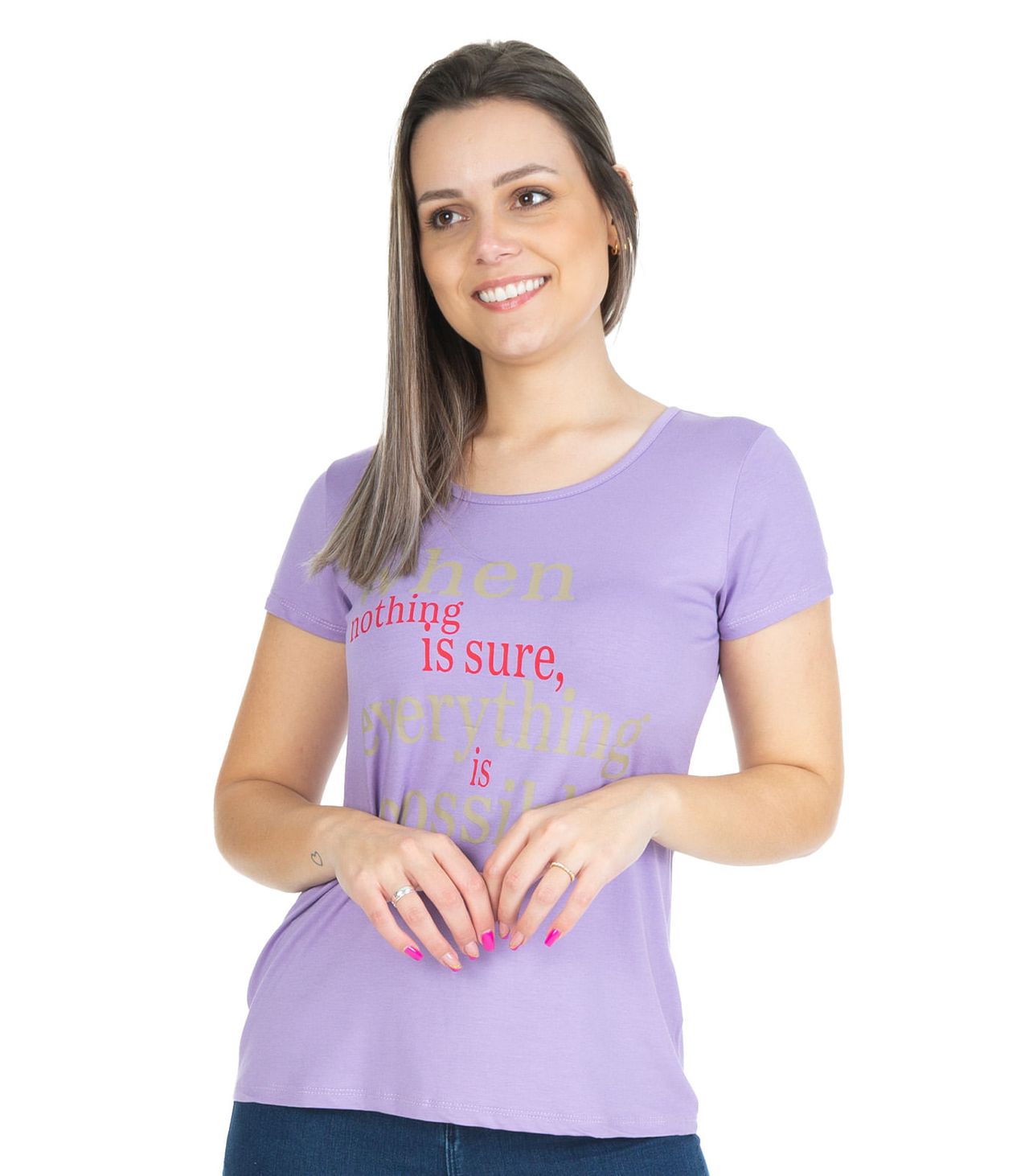 Blusa Feminina Desenvolvida Em Malha Visco Premiere. Modelagem Com Mangas Curtas E Decote Redondo. Possui Estampa Localizada Frontal, Com Frase Em Inglês. Tradução: "quando Nada É Certeza, Tudo É Possível." peça Básica E Estilosa Para Usar Em Diversas Ocasiões! Combine Com: Jeans E Tênis. composição: 96% Viscose 4% Elastano