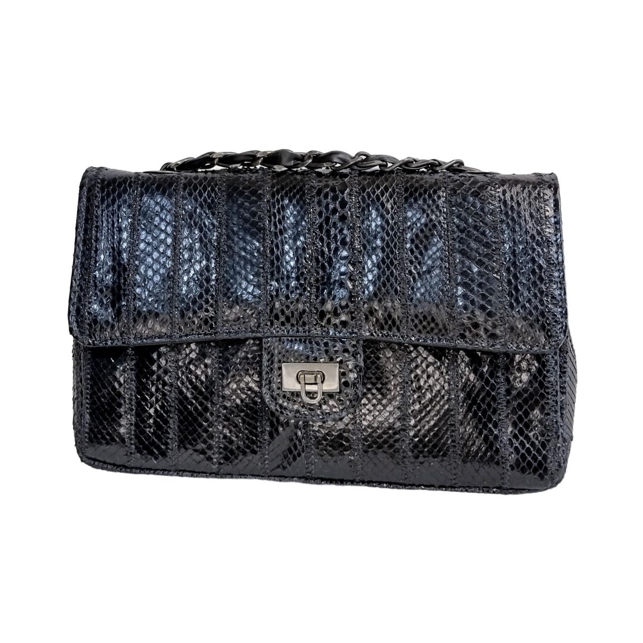 Bolsa Frank Nemeth, Modelo Elizabeth, Confeccionada Com Pele De Python, Alça De Corrente Que Pode Regular O Tamanho.