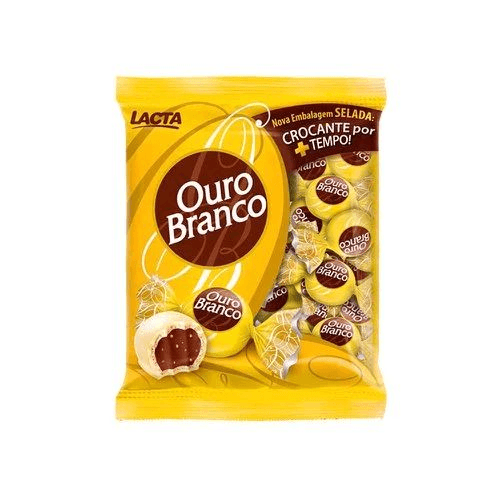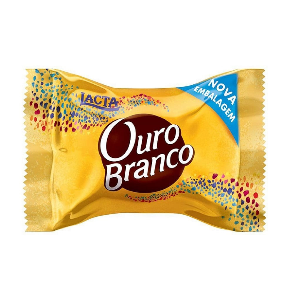 Bombom Ouro Branco saboroso com casca crocante de chocolate branco e recheio macio de chocolate meio amargo. O envio contém: 1 pacote de 1kg com 50 bombons.