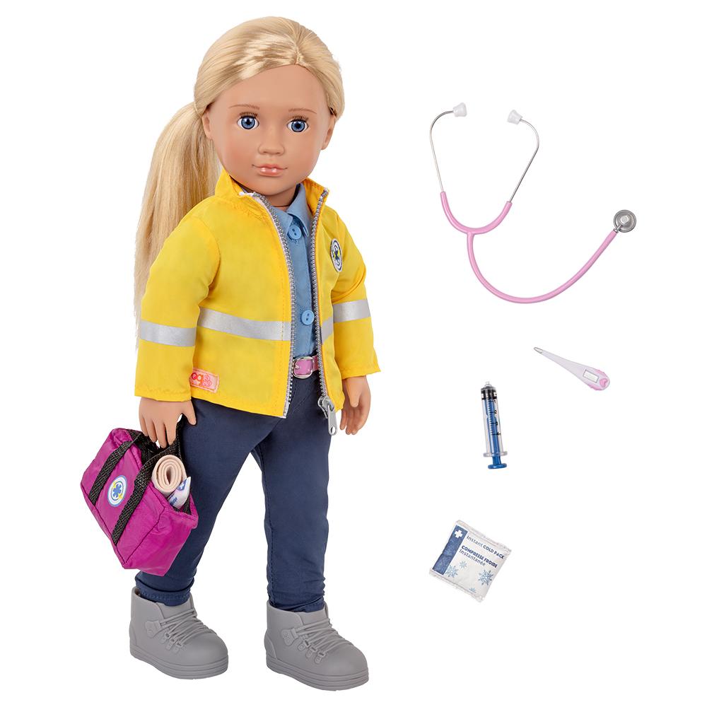 Pronta Para Ajudar Seus Amigos Necessitados! Salve O Dia Com Kaylin! Esta Boneca Paramédica De 46cm Da Nossa Geração Está Sempre Preparada Para Ajudar Suas Amigas Em Momentos De Necessidade. Ela Tem Olhos Azuis Brilhantes Que Abrem E Fecham, E Seu Longo Cabelo Loiro É Divertido De Pentear! Kaylin Tem Todos Os Acessórios Essenciais Em Sua Maleta Médica Para Ajudar A Resgatar Suas Melhores Amigas. Use O Estetoscópio Rosa Para Verificar Os Batimentos Cardíacos E Coloque O Termômetro Debaixo Do Braço Para Medir A Temperatura. Elas Têm Um Lesões Ou Luxações? A Compressa Fria Fará Com Que Eles Se Sintam Melhor Rapidamente, E A Bandagem Envolve A Perna Ou O Braço Para Proteção Extra. Kaylin Tem Um Corpo Macio E Pode Girar Os Braços E As Pernas Para Trocar De Roupa Facilmente Quando Não Está De Serviço. Seu Uniforme Apresenta Uma Jaqueta De Paramédico Amarela Brilhante, Uma Camisa Azul Abotoada, Um Par De Calças Azul-marinho Com Um Lindo Cinto Rosa E Botas Fáceis De Calçar.
