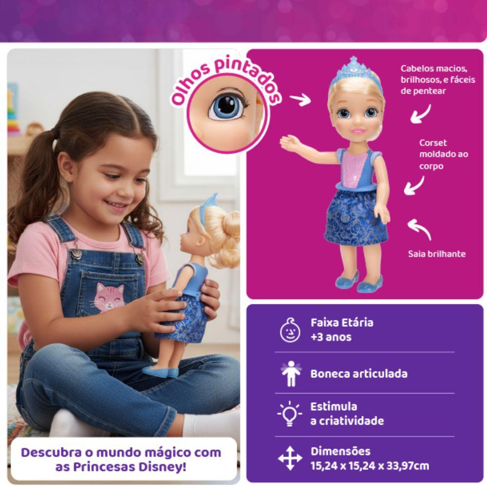Com vestido azul reluzente, uma linda tiara combinando e design fiel ao filme, a boneca convida as crianças a viverem momentos cheios de fantasia, revivendo o grande baile, o encontro com o príncipe ou criando novas histórias cheias de magia e finais felizes.