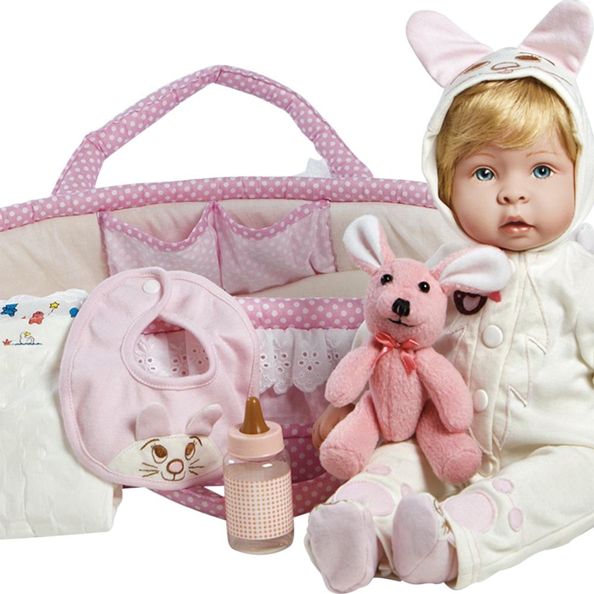 Boneca Reborn Molly e Fluffy - 31017100 Paradise Galleries...Esta graciosa boneca Bebê Reborn 'Molly' e seu querido amigo 'Fluffy' estão prontos para um momento super divertido com você! ..O clima é perfeito e esses dois amigos estão prontos para aproveitar ao máximo o seu tempo juntos. Um dia perfeitamente feliz para sua boneca é quando é amada e se sente protegida nos seus braços, você pode proporcionar esta magia a ela! ..'Molly' tem um rostinho arredondado com feições super realistas, permita que o sol reflita em seus cabelos loiros sedosos e o veja tocar como um doce beijo em seu rosto!...Quando o dia de brincadeiras começar, 'Molly' vai adorar permanecer bem coladinha a você e 'Fluffy' seu coelhinho de pelúcia...Seu macacãozinho com orelhinhas de coelhos, prestam uma linda homenagem a seu melhor amiguinho `Fluffy"...Seu bercinho portátil possui muitos detalhes em rosa suave de bolinhas brancas e detalhes perfeitos nos ilhós com acabamento de rendas, possui bolsos grandes e bufantes, acompanha uma mamadeira rosa, uma fralda e uma babador rosa com rosto de coelho bordado. Sua roupinha é perfeitamente linda com suas mangas longas e com capuz, ainda conta com detalhados botões brancos e costura muito alinhada em rosa por toda parte. Perceba o detalhe do capuz que tem um coelho bordado com o rosto e orelhas em 3D que certamente irá manter o espírito de diversão sem hora para acabar! Verdadeiramente ela é a nova princesa das bonecas realistas, todos querem ficar mais perto de 'Molly e Fluffy'. ...A boneca "Molly" foi cuidadosamente trabalhada com os melhores materiais e possui a tecnologia de nossa marca registrada GentleTouch ¿ Vinil, mede 44 centímetros da cabeça aos pés, 27 centímetros sentada e vem com acessórios mostrados, um certificado de autenticidade numerado, dentro de uma caixa que agrada até o mais requintado colecionador....Conteúdo da Embalagem: 1 Boneca, 1 Coelhinho de pelúcia, 1 Berço, 1 Mamadeira, 1 Babador, 1 Fralda e 1 Certificado de Autenticidade...Idade Recomendada: Para crianças maiores de 06 anos de idade...Atenção: Não recomendável para menores de 03 anos, por conter peças pequenas que podem ser engolidas...Atenção: Não recomendável para crianças menores de 03 anos por conter cordão longo no qual podem se enroscar e sufocar...Aviso: Recomendamos não usar chapinha, secador, escova, pentear, lavar, molhar o cabelo da boneca com água ou qualquer cosmético...Material / Composição: Vinil, tecido, ferro, sintético...Certificação: Certificado pelos Órgãos Autorizados - OCP's (Organismos de Certificação de Produtos) ...Dimensões:..Altura: 44,00 Centímetros..Largura: 19,00 Centímetros..Profundidade: 14,00 Centímetros..Peso: 1,94 Quilogramas