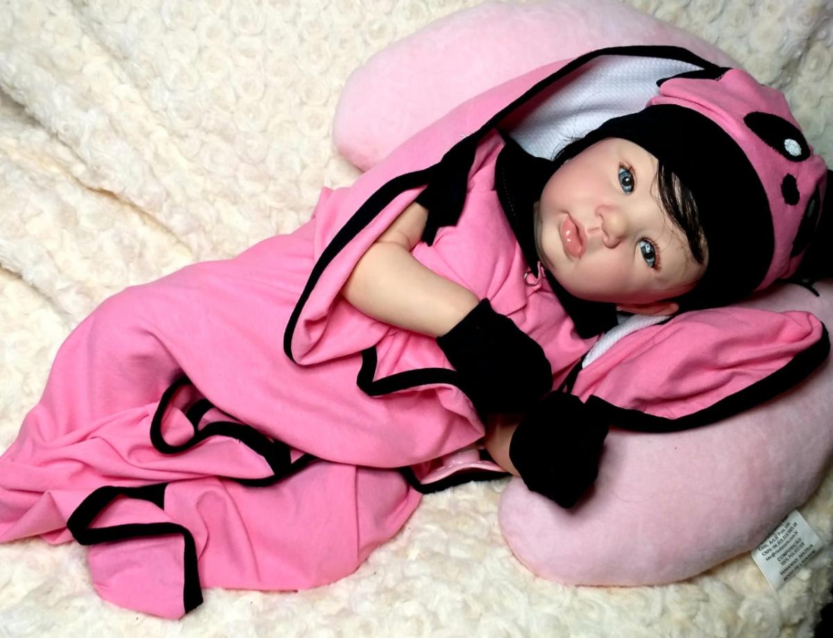 BEBÊ REBORN REALISTA PRONTA ENTREGA Corpo : tecido macio (SUEDE) excelente qualidade, Acompanha enxoval igual ao da foto. Toda a roupinha, chupetas e acessórios são de muito bom gosto e de primeira qualidade. Cílios de verdade, Olhos azuis ( você pode escolher verde ou castanho também) Membros inteiros de vinil siliconado. Cabelo: peruquinha, fibra japonesa Peso: 2 kg aproximado medida:55 cm Pintura: aplicada toda a técnica reborn, manchinhas arroxeadas, manchinhas de frio, veinhas aparentes, unhas francesinha, marquinha de vacina e marquinha do teste do pezinho. O QUE ACOMPANHA A BEBÊ 1 Roupa (igual a da foto) 1 Manta 1 Par De Luvas 2 Fraldas 1 Pente 1 Escova 1 Prendedor de chupeta 1 Chupeta magnética 1 Mamadeira com leite falso 1 Certidão de nascimento 1 Teste do pezinho 1 Manual de cuidados 1 Teste do ultrassom 1 Carteirinha de vacina 1 Passaport 1 Certificado de autenticidade 1 Lindo embrulho. 1 Caixa para proteger o bebê