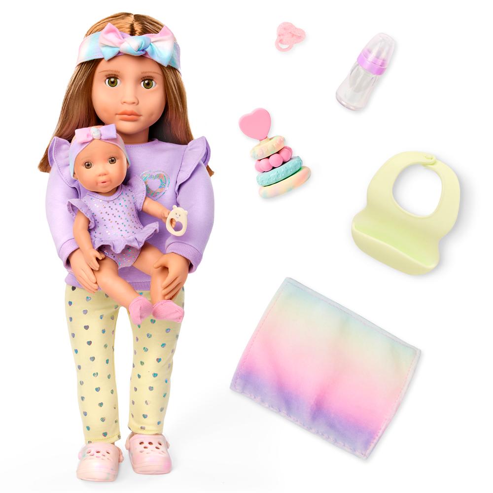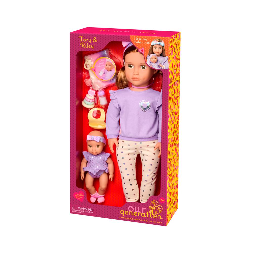 As Bonecas Our Generation Tory E Riley São Perfeitas Para Crianças Que Adoram Brincar De Cuidar E Imaginar Histórias Cheias De Amor. A Tory É A Irmã Mais Velha, Sempre Pronta Para Cuidar Da Pequena Riley, Sua Adorável Irmã Bebê. Juntas, Elas Formam Uma Dupla Encantadora, Com Roupas Combinando Em Tons Pastel E Acessórios Que Tornam A Brincadeira Ainda Mais Completa. A Tory Vem Com Uma Linda Tiara Com Laço, Blusa Lilás Estilosa Com Detalhes Nos Ombros, Calça Com Estampa De Corações E Sapatinhos. Já A Riley Usa Um Body Roxo Com Babadinhos E Uma Faixa De Cabelo Combinando, Trazendo Ainda Mais Charme Ao Conjunto.o Kit Inclui Acessórios Essenciais Para O Cuidado Da Bebê, Como Mamadeira, Chupeta, Babador, Mordedor Em Forma De Argolas Coloridas E Um Cobertor Super Macio Em Tons Degradê. Cada Detalhe Foi Pensado Para Estimular A Imaginação E O Brincar De Faz De Conta, Promovendo Empatia, Responsabilidade E Afeto Nas Crianças. Com Tory E Riley, Cada Momento Se Transforma Em Uma Nova Aventura De Cuidado E Diversão!
