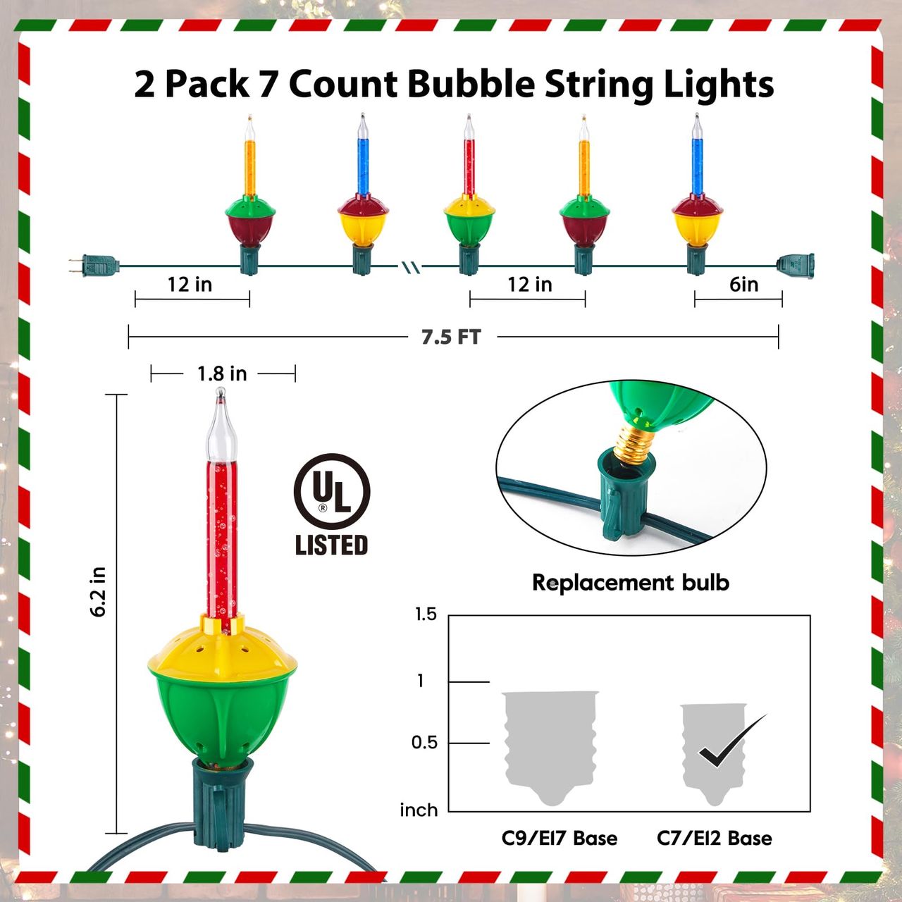 - Pacote Com 2 Lâmpadas De Bolhas Multicoloridas: Cada Pacote De Luzes De Corda De Bolhas De Natal Contém 7 Lâmpadas De Cores Vibrantes, Grafite De 30 Cm Com Plugue Macho, Espaçamento De 30 Cm Entre Lâmpadas, Cauda De 15 Cm Com Conector Fêmea, Comprimento Total De 2,3 M