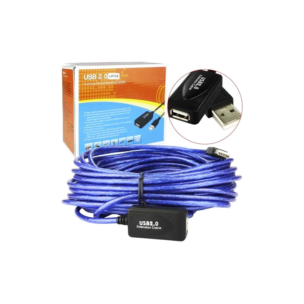 Cabo extensor USB amplificado de 20 metros, ideal para se ligar periféricos a longa distância. Usando a extensão de cabo USB você terá a mesma qualidade de sinal. Para cabos longos o amplificador de sinal é essencial para manter a qualidade da informação. Para alimentação via USB, recomenda-se o uso de equipamentos com consumo de até 500mA. Compatível com dispositivos que tenham entrada USB 2.0 ou anteriores. Especificações Técnicas - Compatível com USB 2.0 a anteriores - Conector USB A macho x USB fêmea com amplificador de sinal - Compatível com Windows® 98 2000 XP Vista 7 / 8 / 10 Linux® / Mac OS® - Plug & Play. Em HD externos ou outros produtos que necessitam de muita energia, o cabo não terá sua funcionalidade de costume.