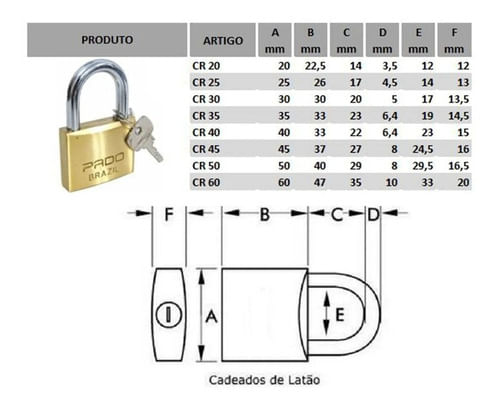 Cadeado LT-50 Pado é um cadeado produzido em latão maciço com haste de 50mm. Cadeado LT-50 Pado é fabricado em latão maciço e haste em aço cementado que garante maior resistência a cortes e arrombamentos, oferecendo mais segurança, além de resistência e durabilidade...Como utilizar/funciona o Cadeado LT-50 50mm - Pado ..Cadeado LT-50 Pado ideal para fechamento de objeto a ser protegido...Características técnicas do Cadeado LT-50 50mm - Pado ..Referência: LT-50,.Tamanho: 50 mm,.Corpo: Latão maciço....Imagens meramente ilustrativas