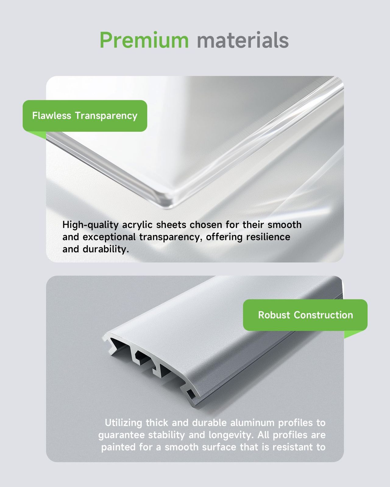 - Materiais Premium: Folhas De Acrílico De Alta Qualidade Escolhidas Por Sua Transparência Suave E Excepcional, Oferecendo Resiliência E Durabilidade. Utiliza Perfis De Alumínio Grossos E Duráveis Para Garantir Estabilidade E Longevidade. Todos Os Perfis São Pintados Para Uma Superfície Lisa E Resistente À Corrosão.