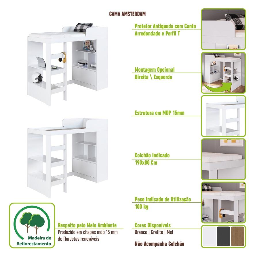 Otimizar Espaços É Uma Das Metas Da Art In Moveis, Por Isso Criamos A Cama Alta Multifuncional Com Estante E Escrivaninha Amsterdam. Este Produto Foi Produzido Em Excelente Material Mdp E Com Acabamento Em Finish Foil Acetinado, Que Garante Maior Resistência E Qualidade Em Seu Móvel. A Essência De Criar Soluções Que Trazem Mais Conforto Sua Vida É O Grande Diferencial Dos Produtos Art In Móveis. Cada Nova Ideia É Uma Mistura De Criatividade, Funcionalidade E Muita Dedicação. *não Acompanha Colchão Dados Técnicos Cama : Dimensões(lap): 194 X 162 X 82 Cm Peso Recomendado: 100 Kg Peso Bruto: 72 Kg Cor: Branco Material: Mdp Acabamento: Finish Foil Acetinado Colchão Recomendado: 190 X 80 Cm Montagem Direita Ou Esquerda Informações Adicionais: Garantia De 90 Dias Para Defeitos De Fabricação, Limpeza Deve Ser Feita Com Pano Macio E Seco Ou Levemente Umedecido Com Água E Sabão Neutro. Não Devem Ser Utilizados Abrasivos Como Palha De Aço E Objetos Cortantes, Acompanha Manual De Montagem Detalhado E Kit De Ferragem, As Imagens Ambientadas São Meramente Ilustrativas E Podem Apresentar Itens Que Não Compõe O Produto, As Cores Do Produto Podem Variar De Acordo Com O Monitor, A Iluminação Do Ambiente Ou Sua Percepção Visual.