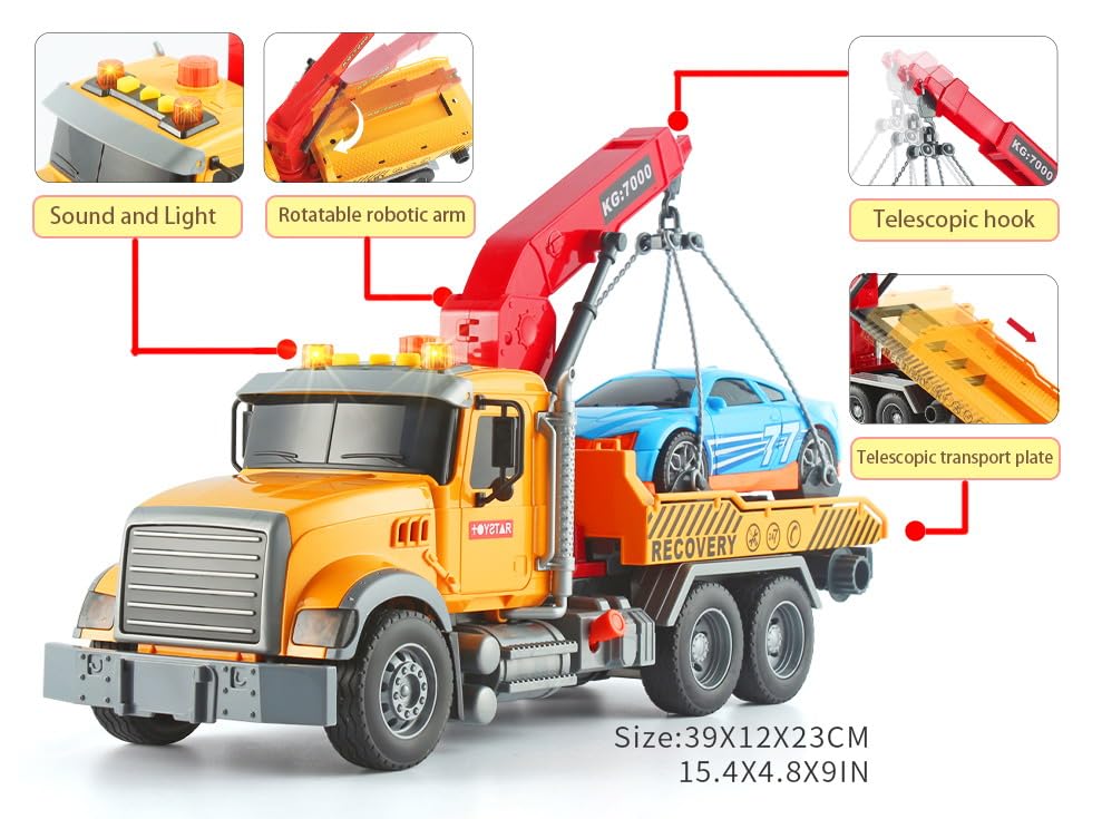 - “big Tow Truck Toys” - Medindo 15 X 4,7 X 9 Polegadas. Vem Com Um Carro Pequeno. Nosso Caminhão De Brinquedo É Perfeito Para Crianças Que Adoram Brincar Com Carros. Feito De Plástico Abs Durável, É Feito Para Durar.