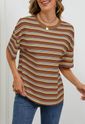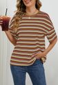 — Características: Design Listrado Colorido, Manga Curta, Gola Redonda, Decote Canelado, Caimento Folgado, Camisa Casual, Camiseta Básica, Estilo Fofo, Blusa De Verão Para Mulheres Na Moda De 2025