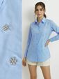 Moda e AcessóriosModaCamisasCamisa Social Feminina Azul Bebê Com Flor De Strass Margarida Premium Blusa De Luxo Manga Longa Elegante