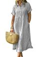 - Vestido Midi Longo De Botão Para Mulheres, Com Padrão De Listras Contrastantes, Gola Básica De Lapela Virada Para Baixo, Fecho Frontal De Botão Trespassado, Silhueta Rodada, Manga Curta, Comprimento Abaixo Do Joelho.