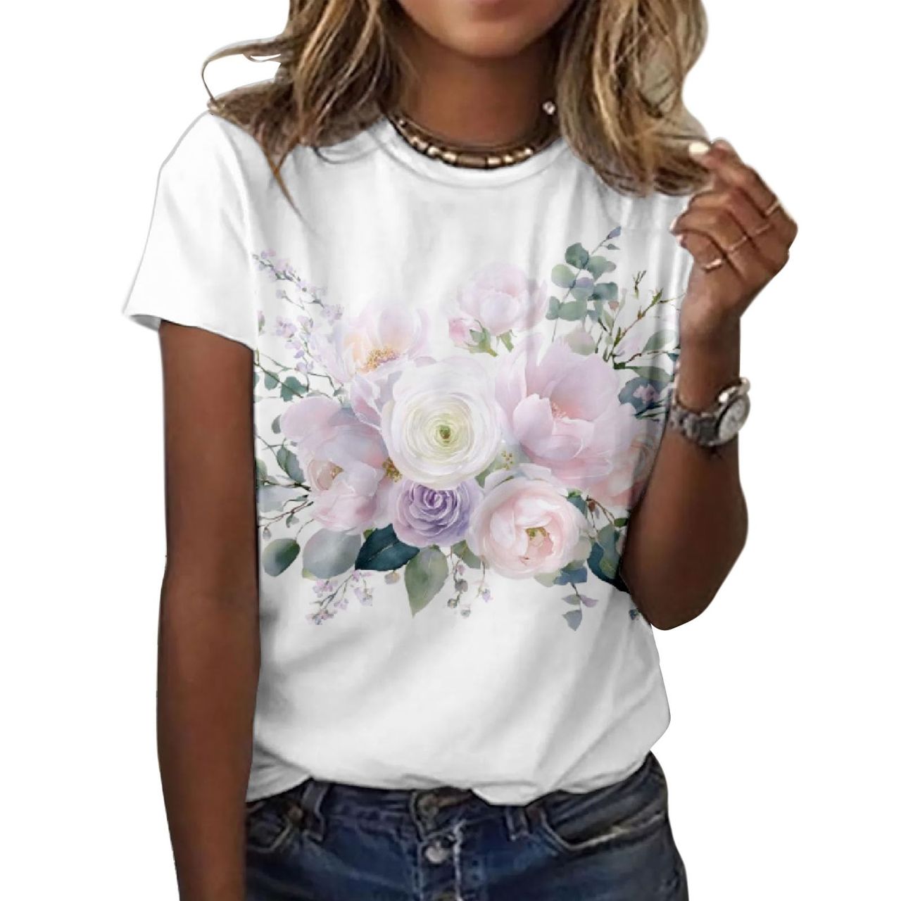 Moda e AcessóriosModaCamisetasCamiseta Feminina Zocania Com Estampa Floral, Mistura De Algodão, Blusa Casual