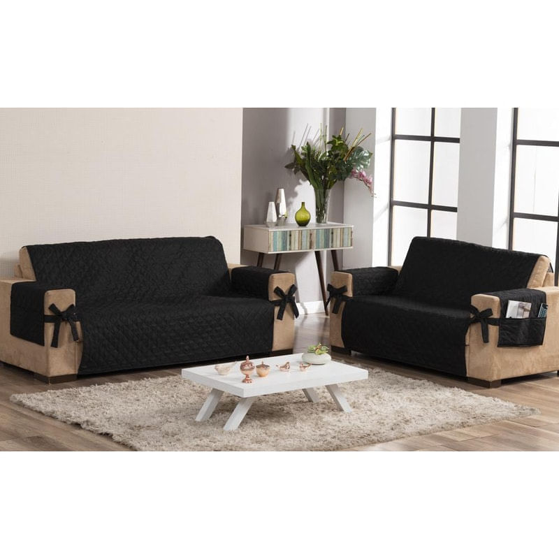 Capa protetora de sofá 2 e 3 lugares com porta controle e laço preto . Protetor de sofá 2 e 3 lugares face única com laço o kit capa para sofá é feito para diversos tipos de sofá, é ideal para você decorar a sua sala para que você receba sua visita em um ambiente mais bonito e agradável, além de proteger o seu sofá de manchas, sujeiras e outro tipo de dano que possa ser causado com o tempo. contém: 01 protetor de sofá para 2 lugares 1,90m x 1,10m.01 protetor de sofá para 3 lugares 1,90m x 1,50m.Medida dos 4 protetores para braço: 0,75cm x 0,48cm composição: tecido: 100% poliéster enchimento: 100% poliéster forro: tnt gramatura 20 detalhe do laço: todo matelado fabricação própria marca:Beatriz Enxovais
